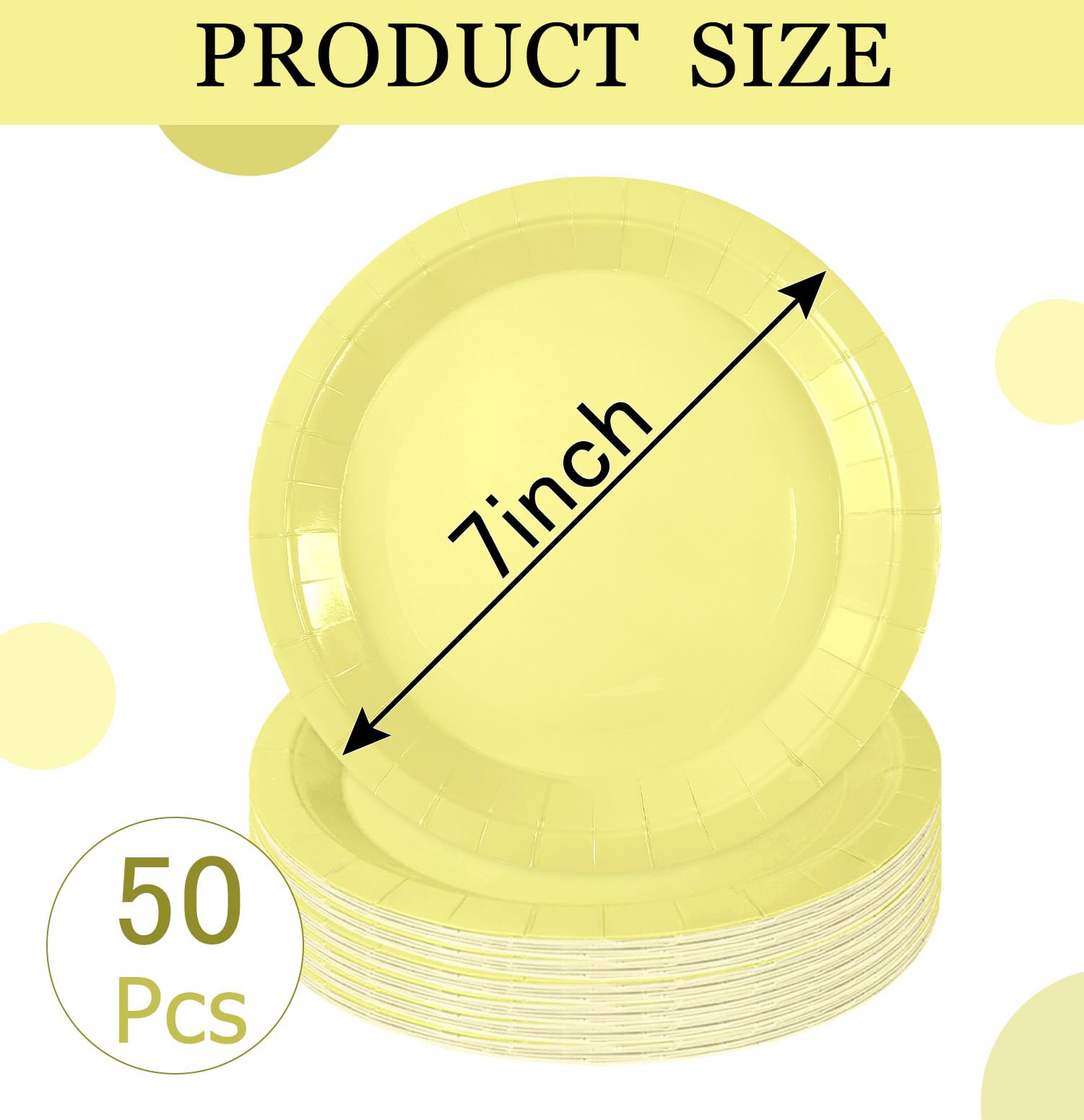 About our dessert plates: You will get 50 pcs yellow party plates and the size is 7 inches. The yellow paper plates are large enough and the quantity is also enough for you to use at the party