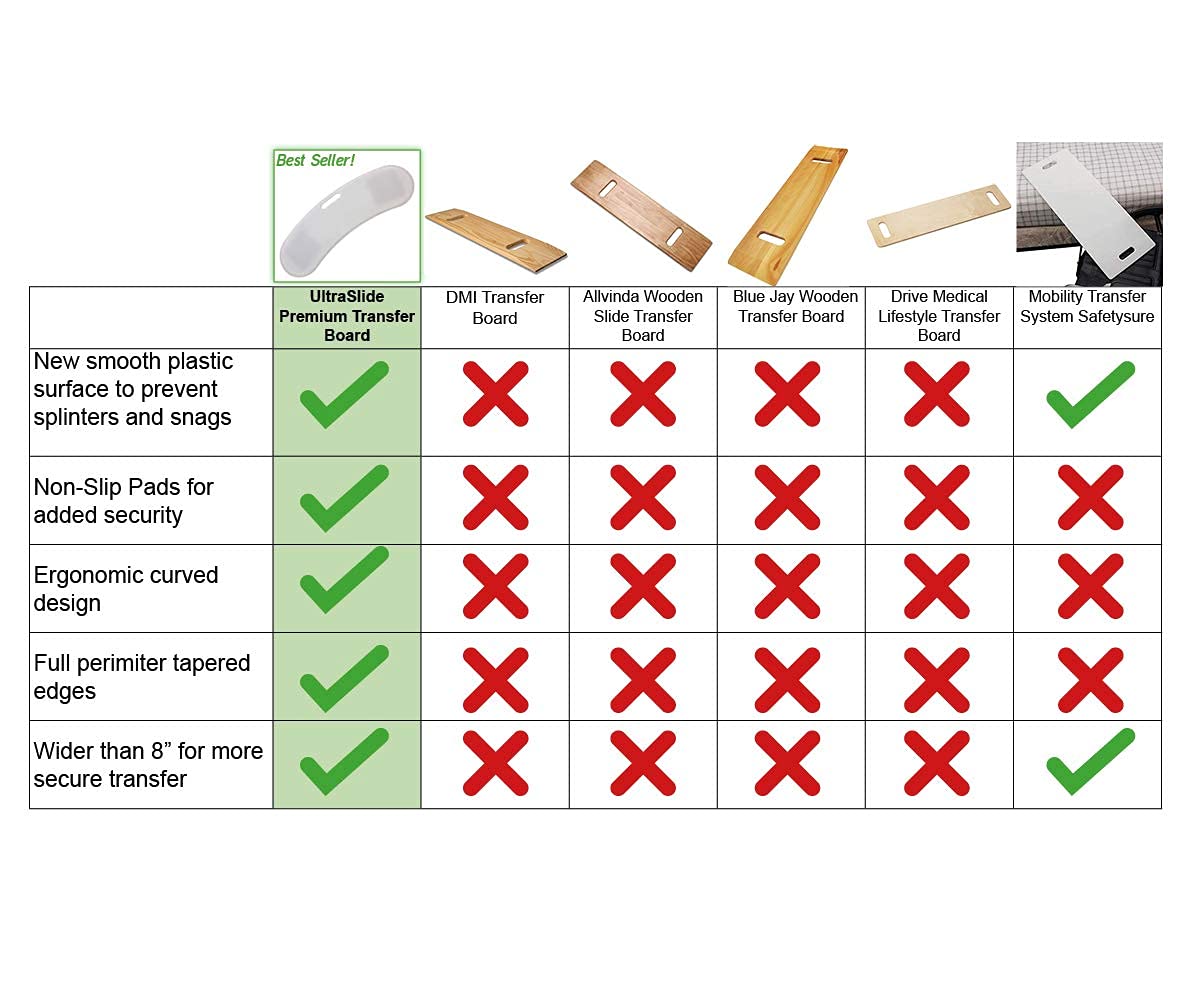 NEW STYLE SMOOTH PLASTIC SURFACE: Next generation transfer board eliminates the issues commonly found in old style wooden transfer boards like splintering, catching on clothing, rough and difficult sliding and uncomfortable/dangerous contact with the skin. The UltraSlide will never splinter and allows users to safely, smoothly and easily slide across the surface. Transfers become simple and almost effortless.