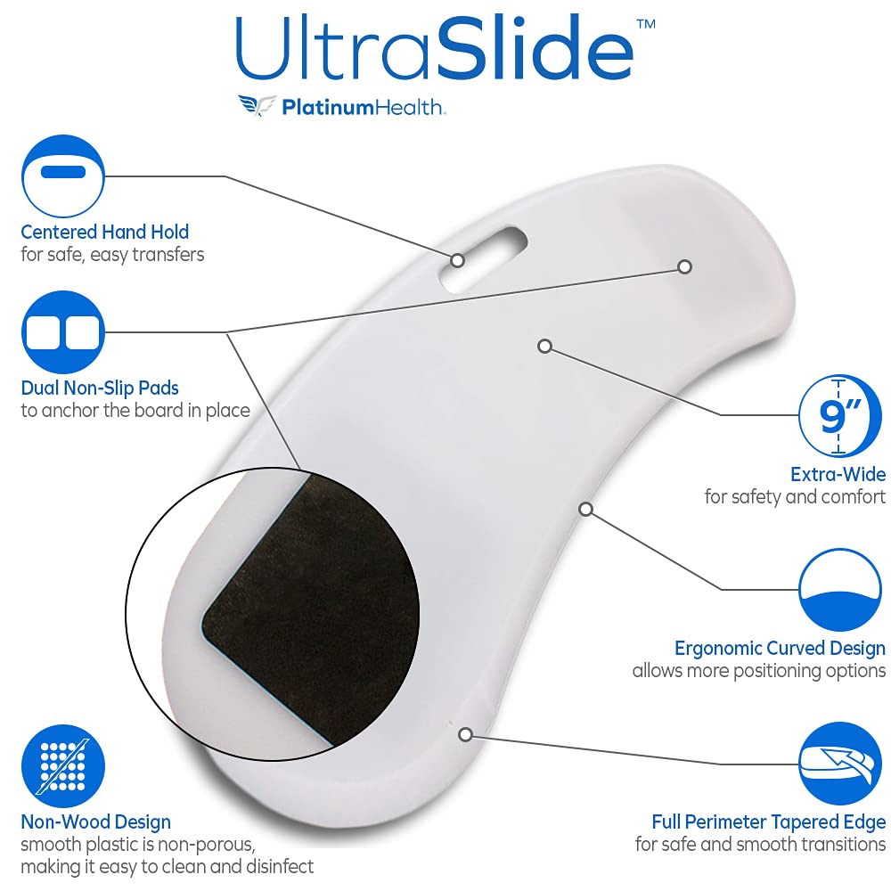 FULL PERIMETER TAPERED EDGES: The UltraSlide features an industry exclusive full perimeter tapered edge design. This makes the UltraSlide the most comfortable slide board available since regardless of placement, transitioning to and from the board is safe and smooth. There are no square edges commonly found on all other slide boards that make transitions uncomfortable and potentially dangerous to skin integrity. Its no wonder that the UltraSlide is consistently VOTED #1 BEST TRANSFER BOARD.