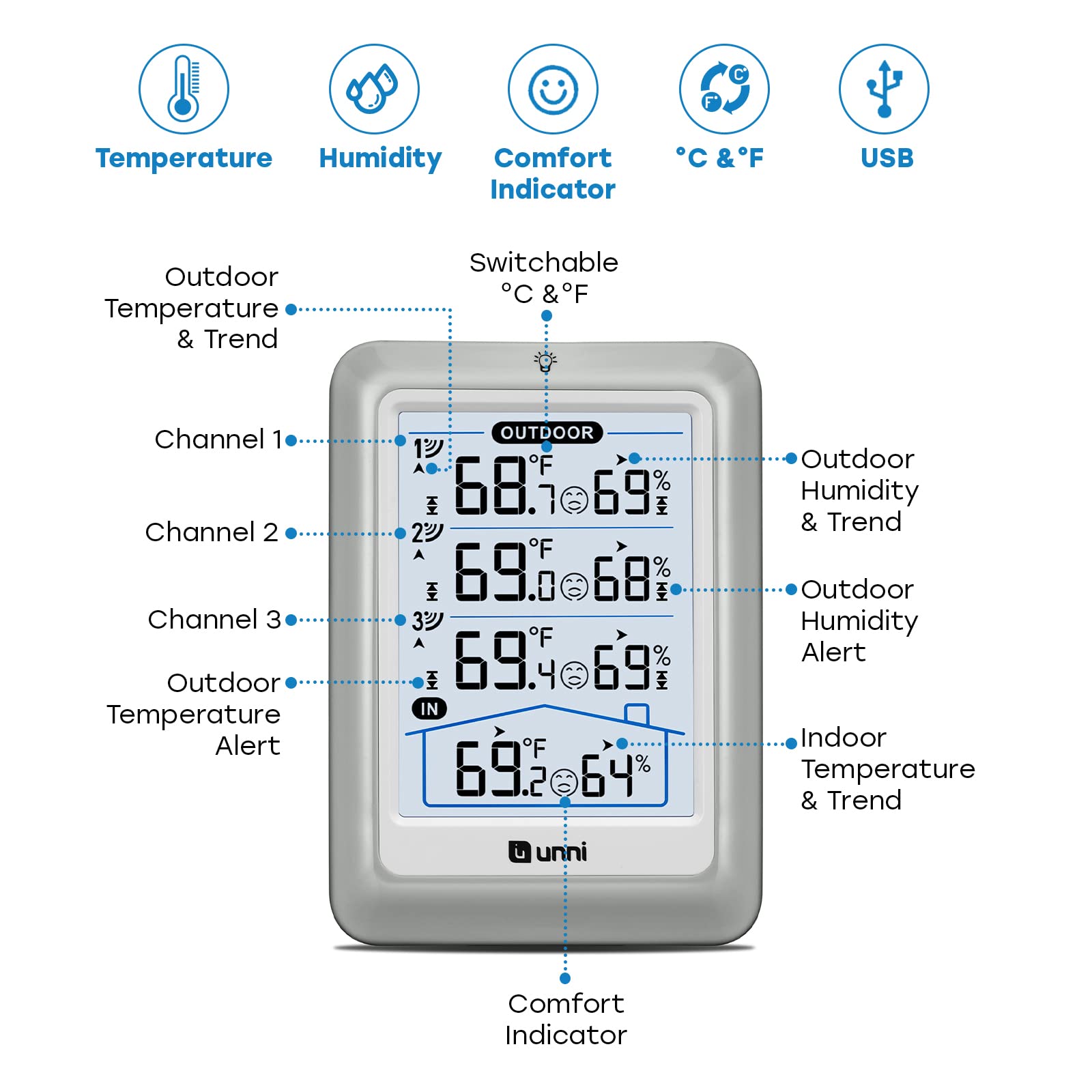 DISPLAY 3 SENSORS DATA, TRANSMISIION 328FT/100M – Unni has advanced patented wireless technology that provides more powerful and steady data transmission. Wireless temperature humidity monitor updates and transmits temperature and humidity data up to 330 ft radius every 30 seconds, that will help you monitor all the locations you care about the most.