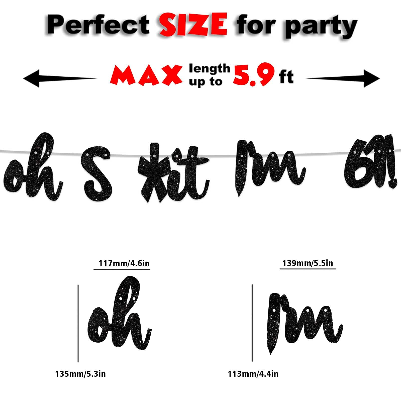 Size: The banner’s total length is 5.9ft, each oh’s hight is 5.3inch, width is 4.6inch, each I'm hight is 4.4inch, width is 5.5inch