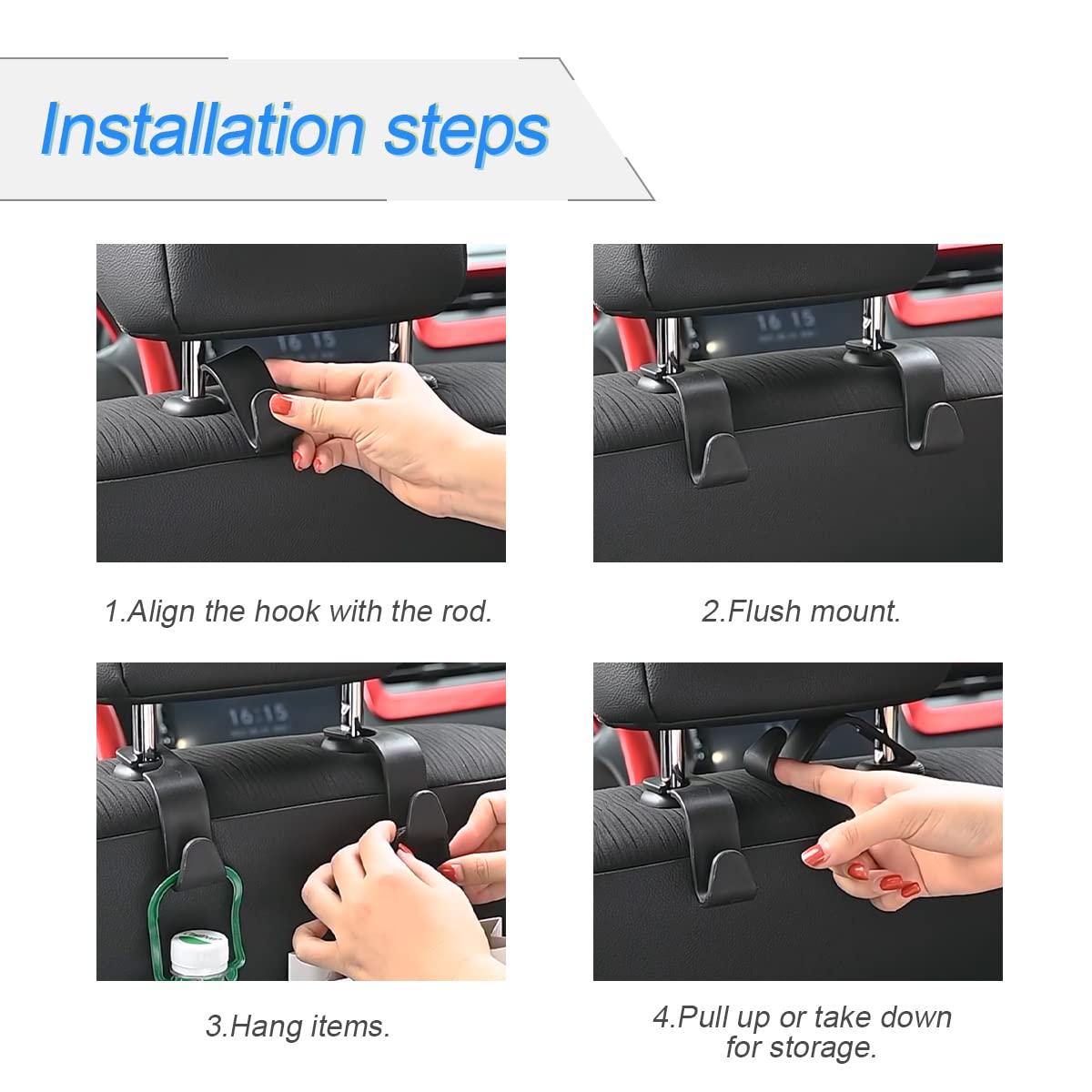 Easy to install: You can easily install these hooks without removing the headrest.You can freely set or remove the hooks in sec without extra tools, quick and convenient.