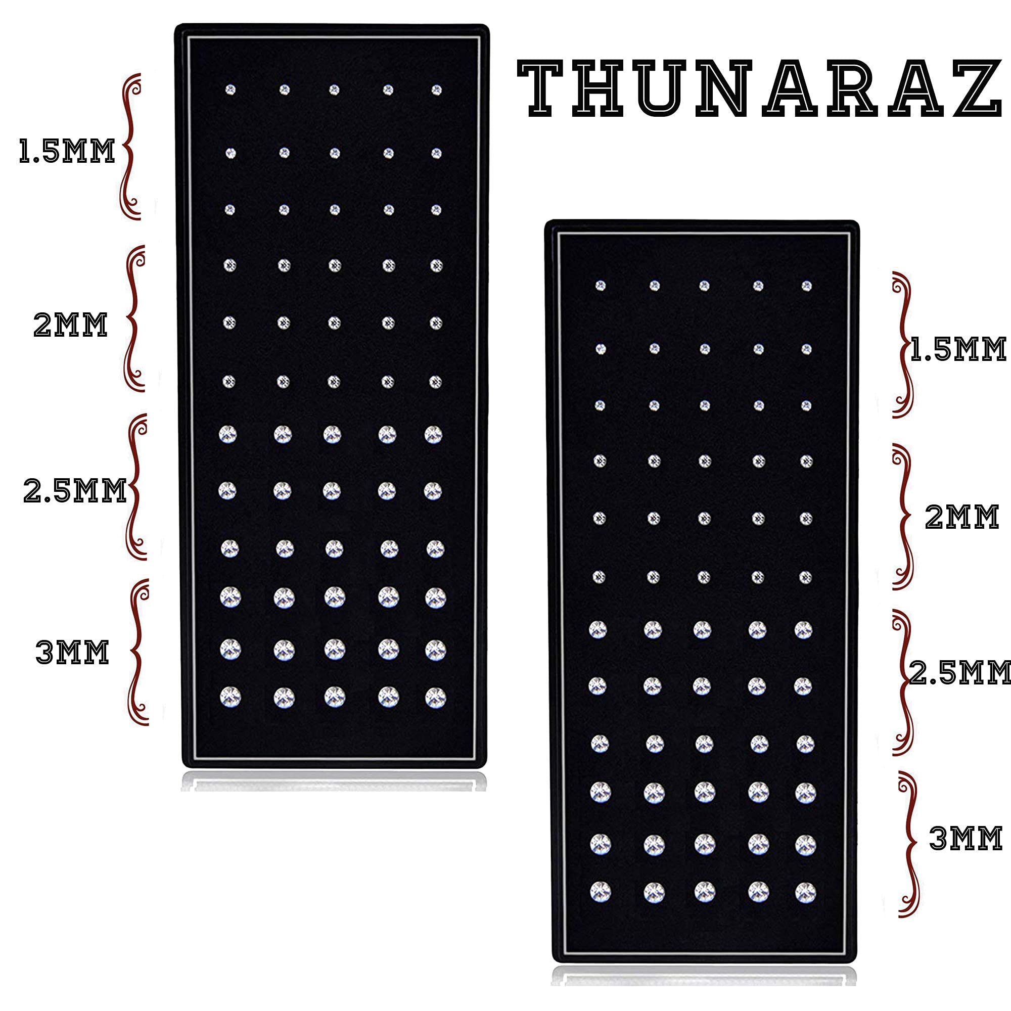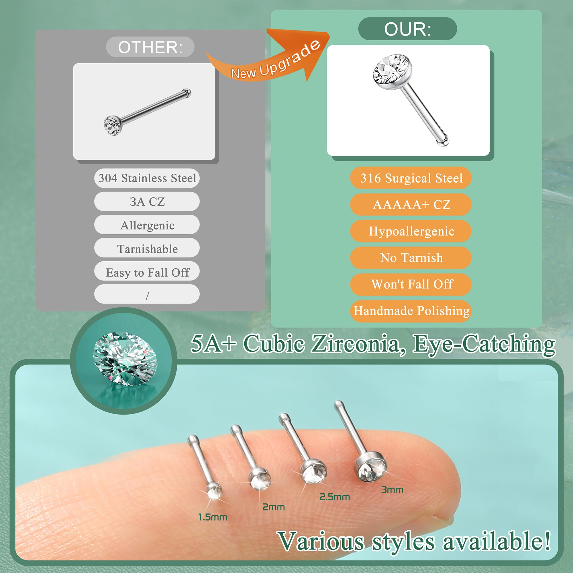 Assorted Collection: Including four sizes nose sud rings; Two shap Styles: (L and straight); L shape: 15pcs 1.5mm, 15pcs 2mm, 15pcs 2.5mm, 15pcs 3mm; Straight style: 15pcs 1.5MM, 15pcs 2mm, 15pcs 2.5mm, 15pcs 3mm. Gauge: 20G =0.8mm, 7mm wearable length, crystal studs; Perfect as daily jewelry