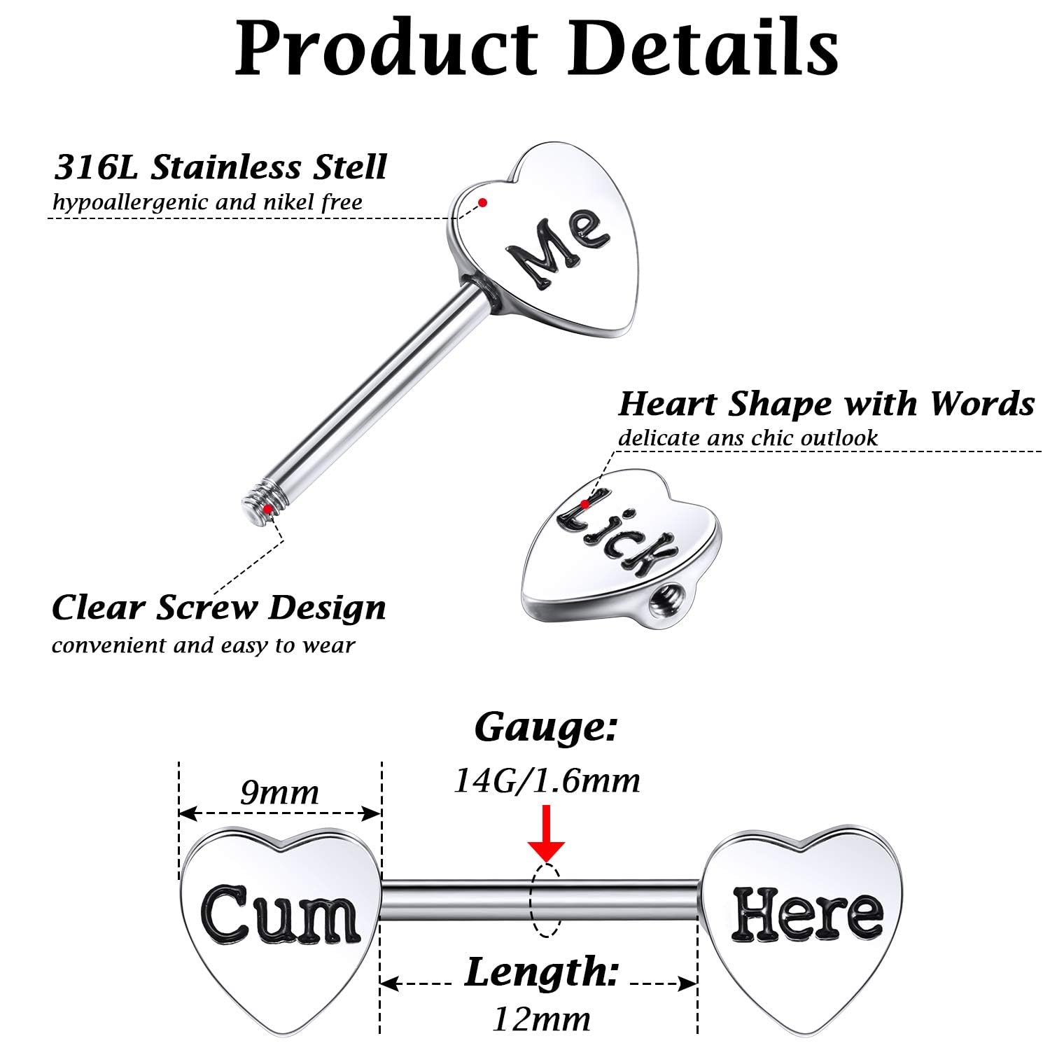 Size details: barbell tongue rings measures about 0.55 inches/ 14 mm in bar length, and 1.6 mm/ 14 G in gauge size, the heart is 0.35 inches/ 9 mm, one size fits most women, easy to wear and take off, which won't fall down easily