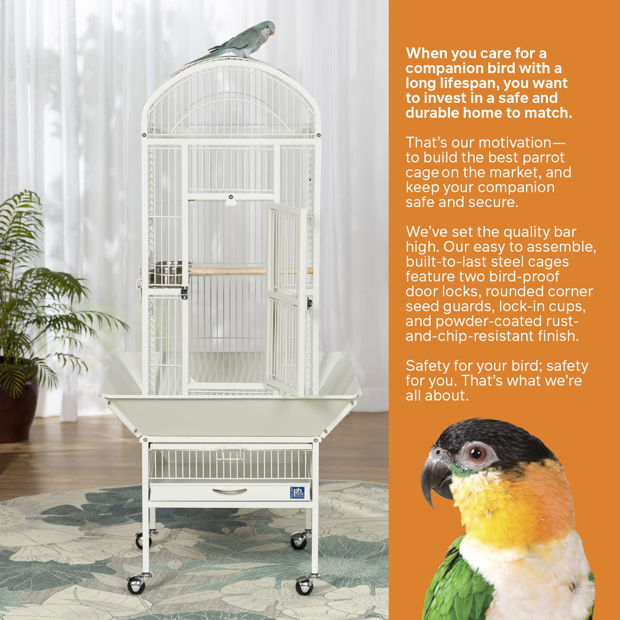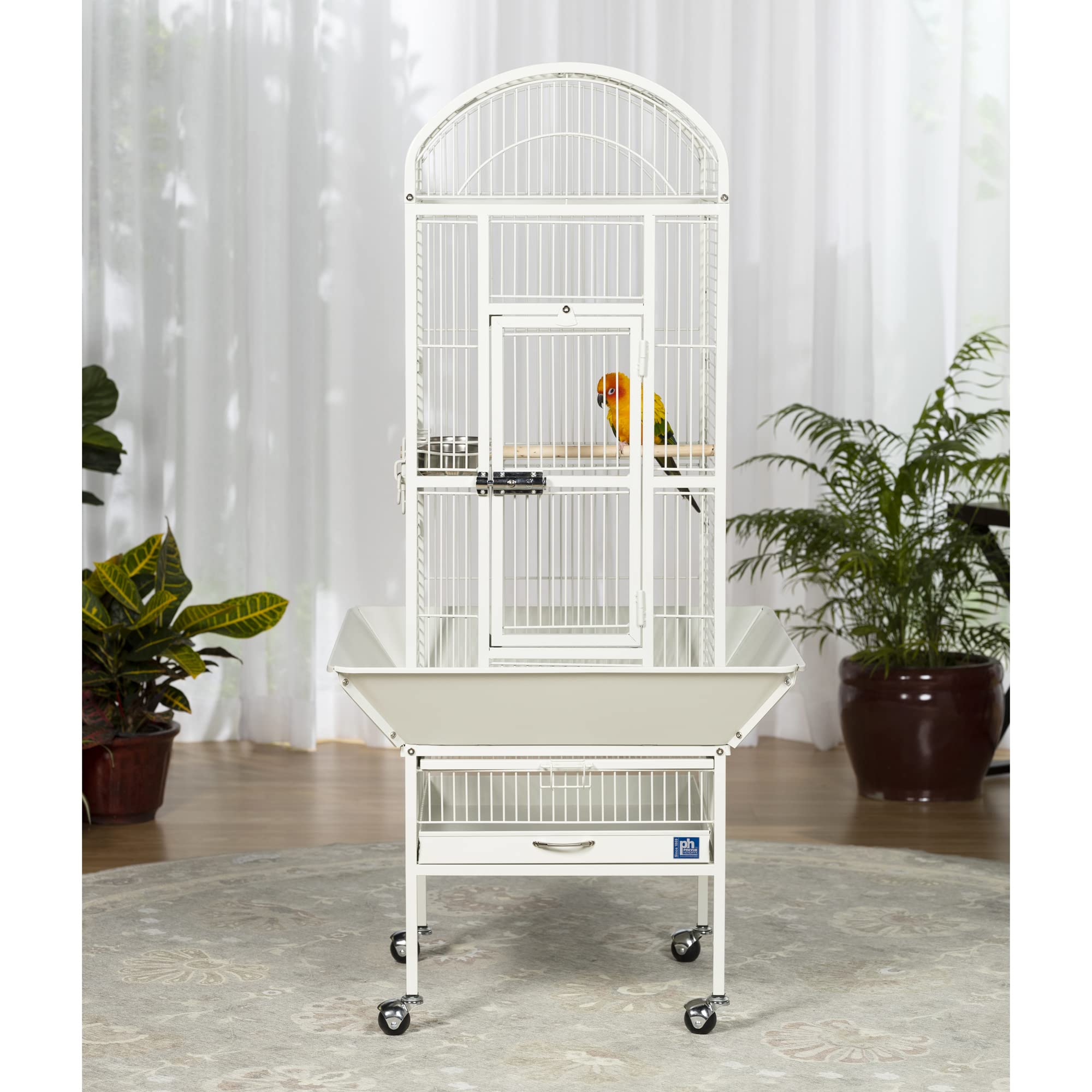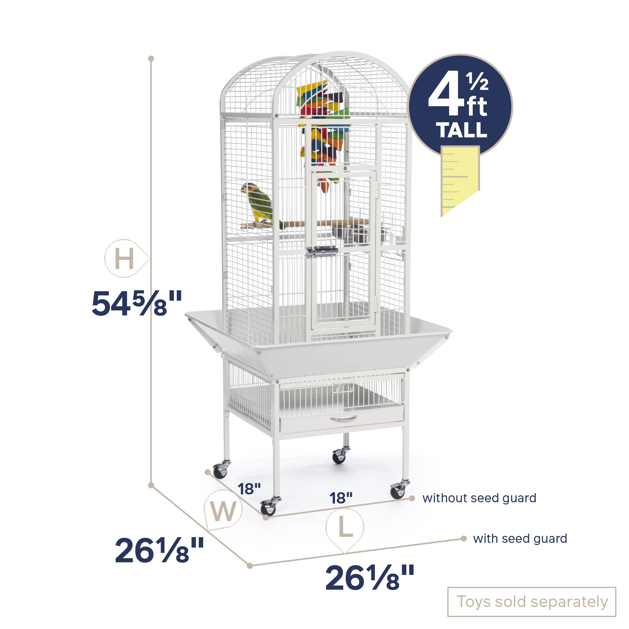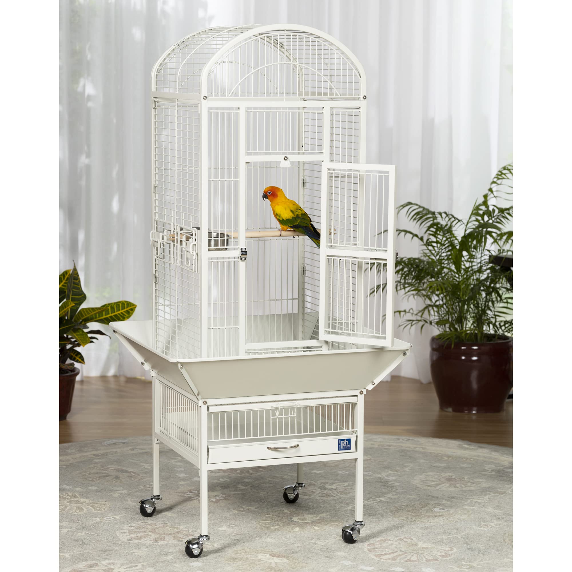 Prevue Pet Products small Dome top bird cage Chalk White 34512 features a roomy and refined dome top roofline with Extra space for hanging toys and letting your bird stretch its wings. Expertly engineered in the USA to be easily assembled and loaded with owner, and bird, friendly features, our wrought iron constructed cage offers quality craftsmanship at an affordable price. Rounded corner seed guards help control mess outside of the cage and are less likely to damage walls or catch on your clothing, seed guard measurements are 26 1/4quot; long and 26 1/4quot; wide. Both grille and debris tray are removable for ease of cleaning and the integrated cage stand sits on sturdy, easy rolling casters. The large front access door measures 8 frac12;quot; long by 18 frac12;quot; high and closes securely with a push button lock plus a wind bell lock to prevent any escape artists from pushing the door open. Included with this cage are 2 stainless steel 12 oz. Food/water cups, which lock into place within the 6quot; long by 4 3/8quot; high cup doors and a generously sized 11/16quot; wooden perch. Finished with a durable and elegant Chalk White powder coating, Prevue cages undergo independent lab testing and conform to the highest levels of pet safety. Prevue Pet Products small Dome top bird cage Chalk White 34512 is constructed from 9 amp; 10 gauge wire and measures 18quot; long, 18quot; wide and 54 5/8quot; high with 3/4quot; wire spacing.