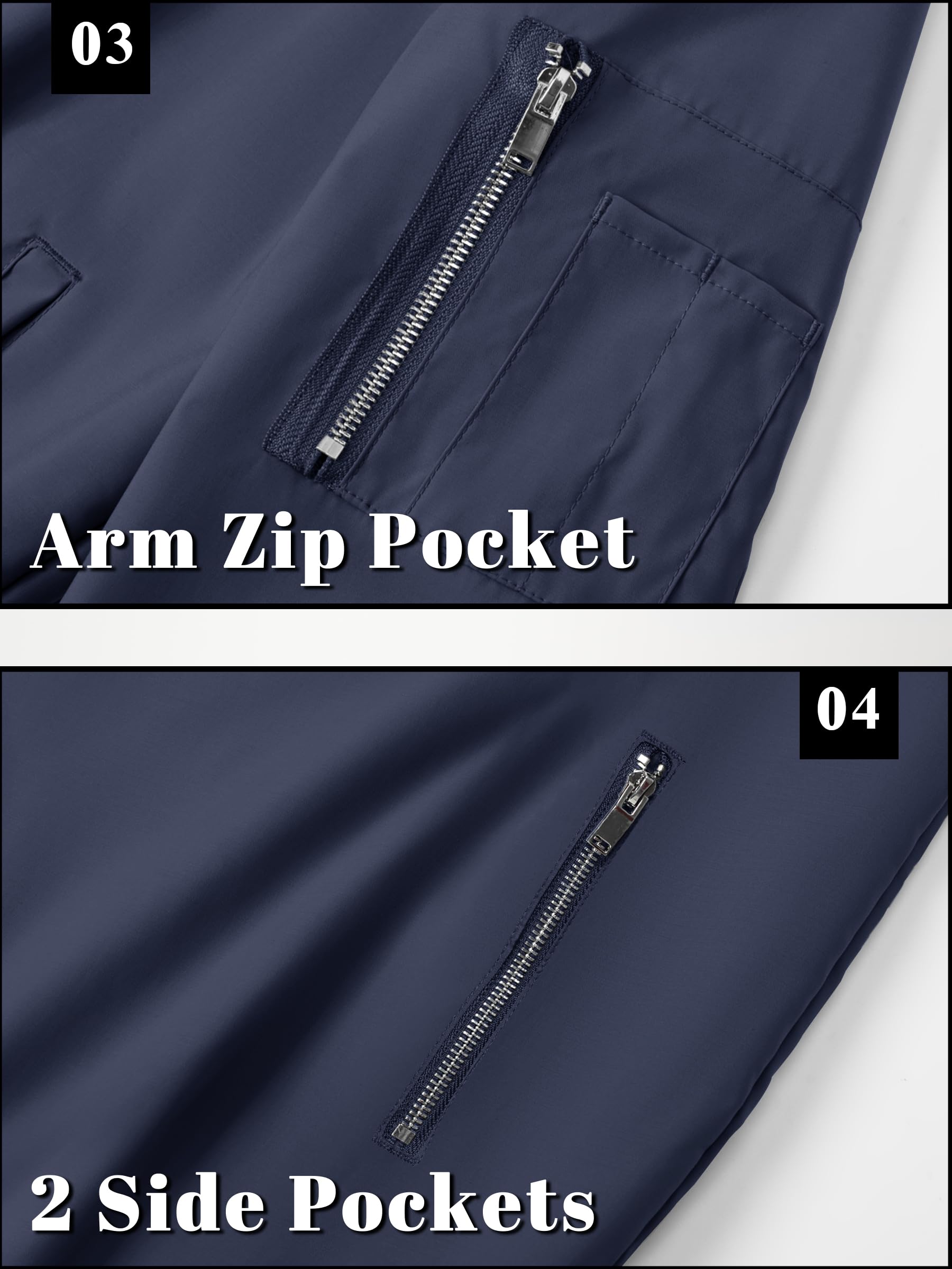 MULTI-POCKETS: 1 zipper sleeve pocket, 2 zipper slant hand pochets, 1 inner pocket