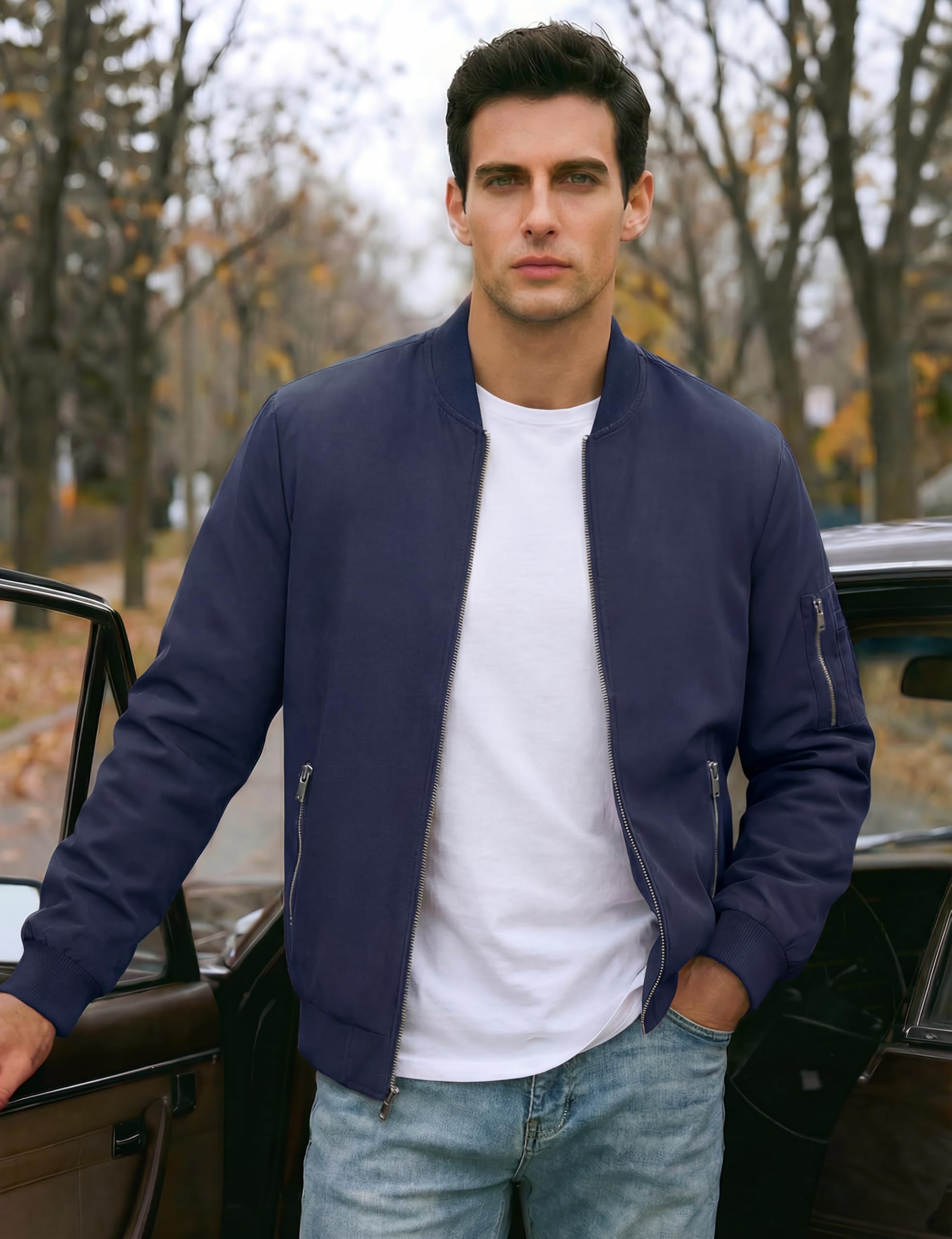 Full zipper stand collar bomber jacket, The zipper head is on the left
