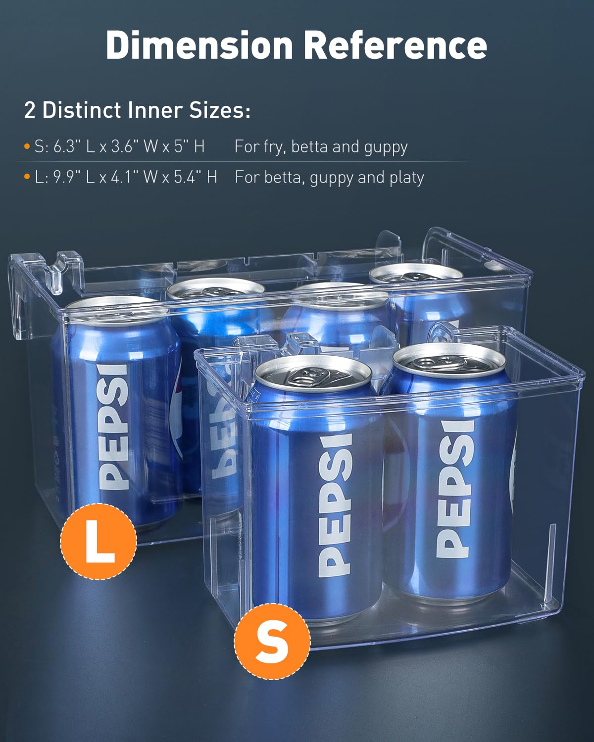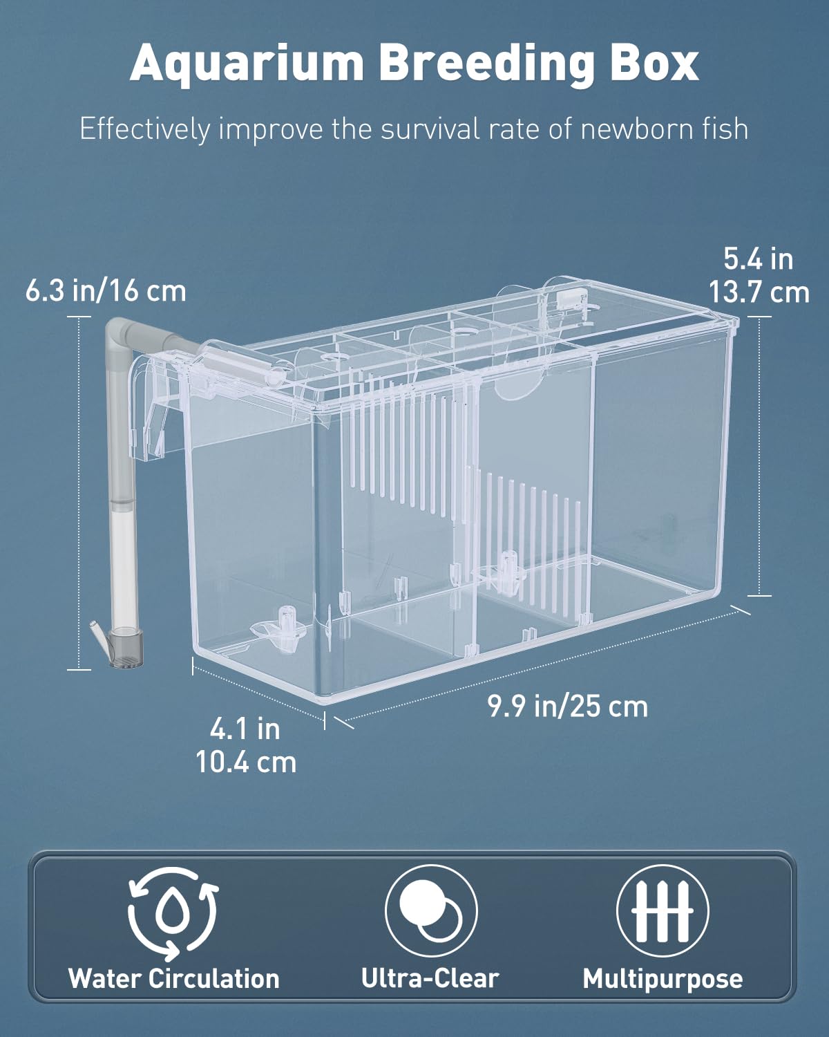 Large Hatching Box: Inner size: 9.9" L x 4.1" W x 5.4" H. The aquarium fish breeding box is a safe haven for vulnerable fry, shrimp, and small fish. Effectively protect newborns from being eaten or attacked to ensure a higher survival rate