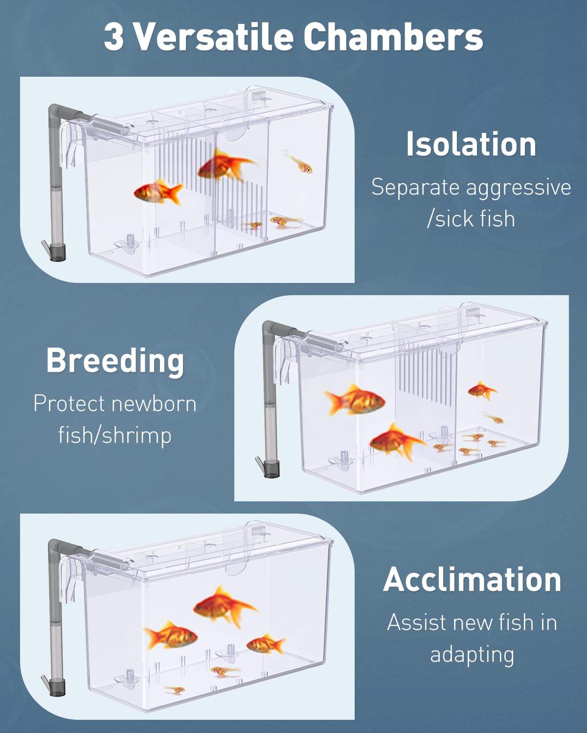 3 Versatile Chambers: 2 removable dividers create up to 3 separate compartments. Ideally isolate aggressive or sick fish and acclimate new inhabitants to the tank environment. Always provide enhanced protection for varied aquatic life