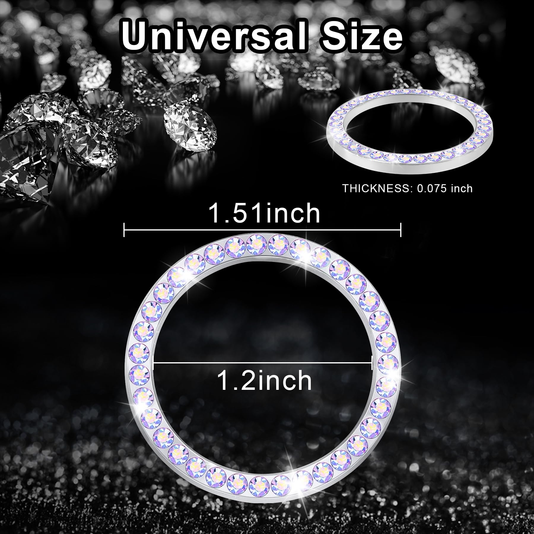 【Universal Size】This rhinestone car decoration accessories diameter is 1.51 inch; inner diameter of the ring is 1.2 inch; thickness is 0.085 inch.Fits most cars, SUVs, MTVs with ignition start button.