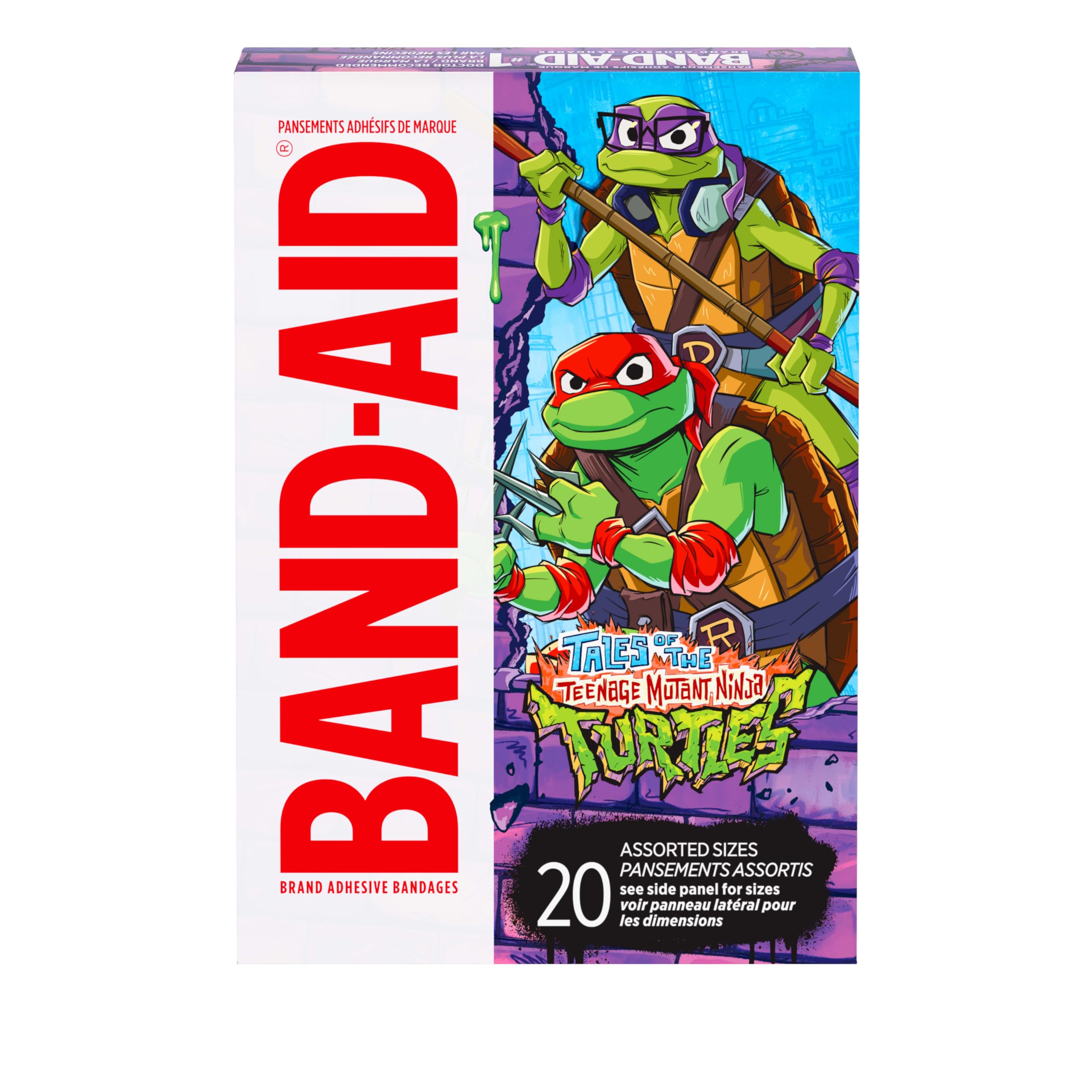 Cover and help protect your little one's minor wounds with BAND-AID Brand Adhesive First Aid Bandages featuring Nickelodeon Teenage Mutant Ninja Turtles characters. Perfect for kids and toddlers, these sterile, adhesive bandages from the number one doctor recommended bandage brand are made to cover and help protect minor cuts, scrapes, and blisters from dirt and germs so they can heal better. Each individually wrapped bandage features a non-stick pad that doesn't stick to the wound for easy, painless removal. Decorated with fun colorful designs featuring the characters Leonardo, Donatello, Michelangelo, and Raphael from the hit animated show, the bandages make first aid more fun. These sterile adhesive bandages come in assorted sizes, all ideal for covering small wounds, and make a perfect addition to any first-aid kit or at home wound care supplies.
