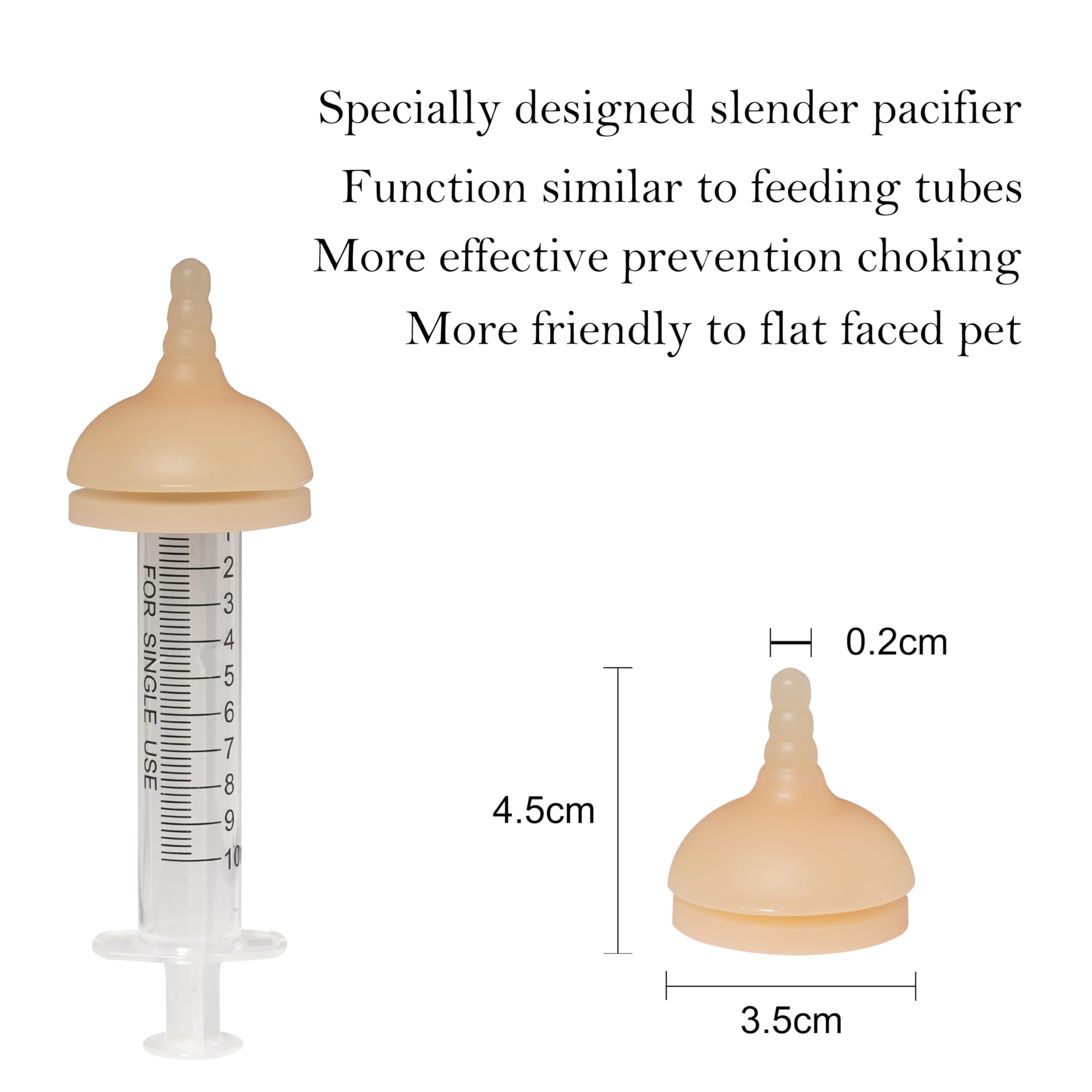The material mimics the feel of pet mom. It is designed with a kneading pad that allows the animals to knead with their small paws as they nurse as they would do naturally. Nipple prevents air ingestion during feeding. Syringes are included in the package. The nipple flow rate allows for natural feeding. With proper use will prevent aspiration of formula. It would help reduce gas and colic in newborns