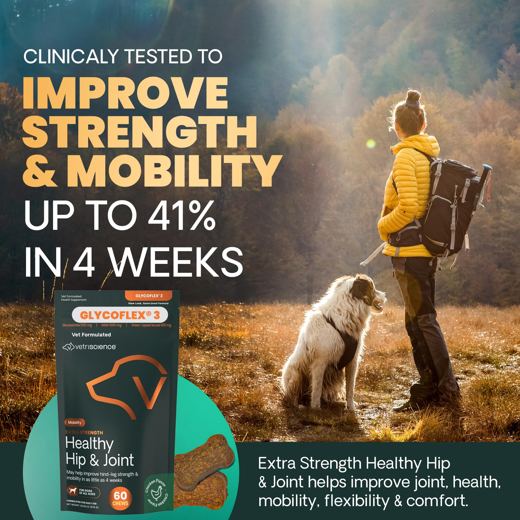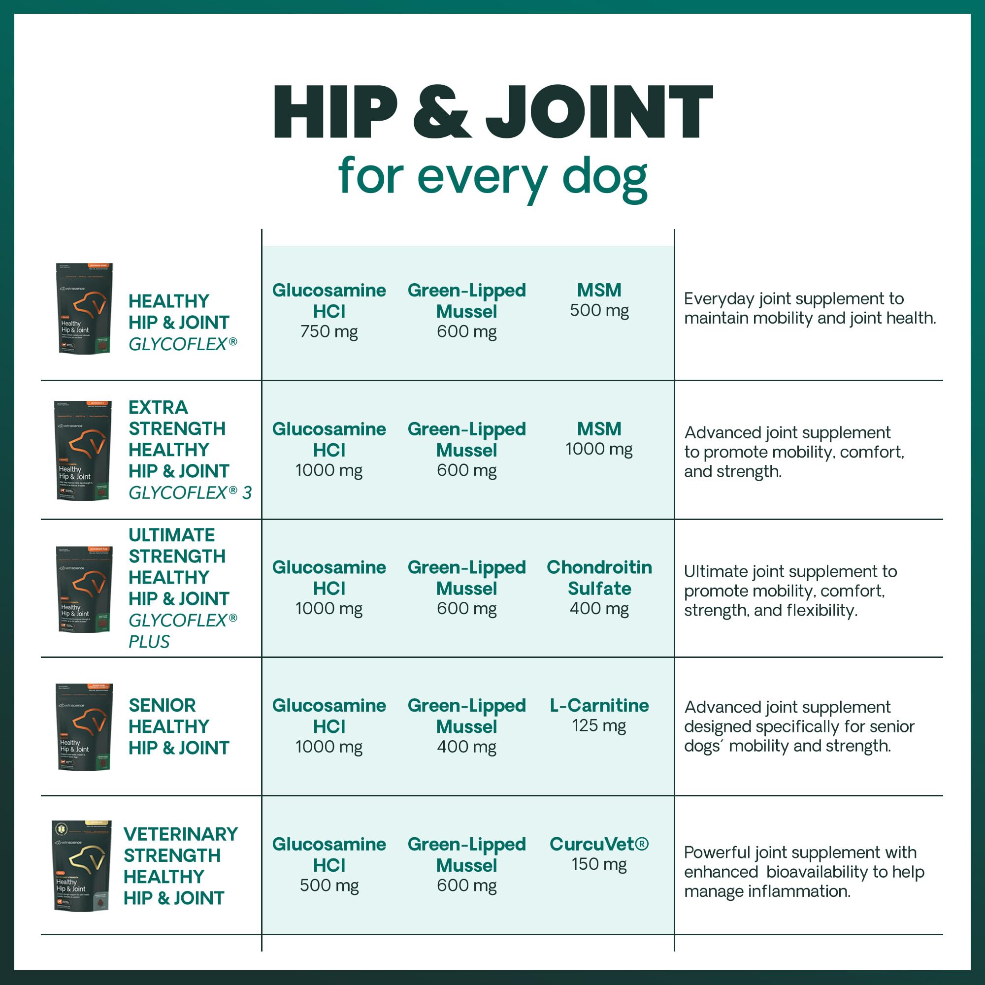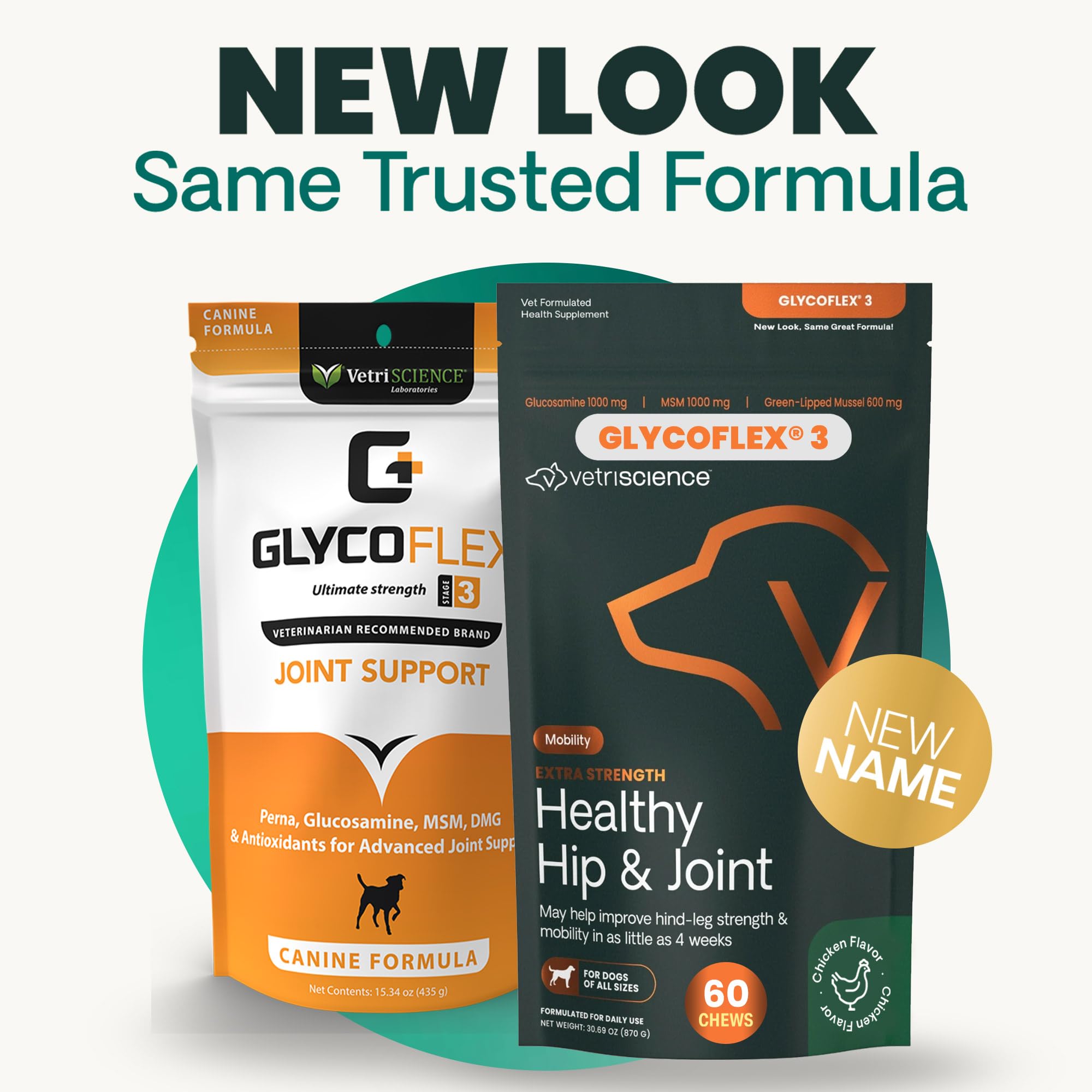 Glucosamine for Dogs: Extra Strength Healthy Hip & Joint (previously GlycoFlex Stage 3) is our advanced-strength hip and joint supplement for dogs, with powerful levels of active ingredients that work together to help maintain mobility, lubricate joints, and support flexibility