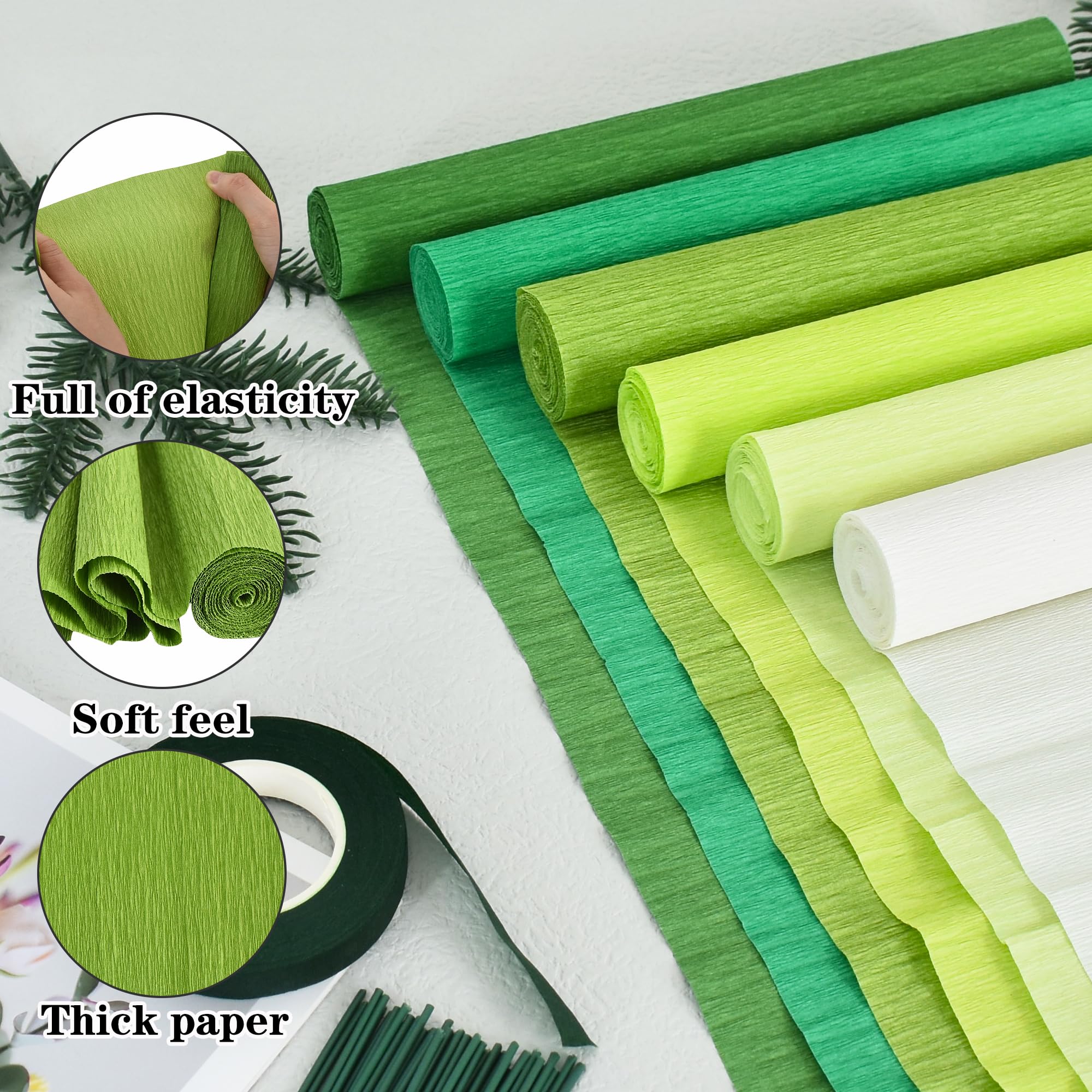 【Size】You will receive 6 rolls of 6 different colors of crepe paper, each crepe paper roll 10 inches x 8 feet, 50 green flower wires, and 1 pcs green tape. These crepe paper are sufficient to meet your various decorative needs.