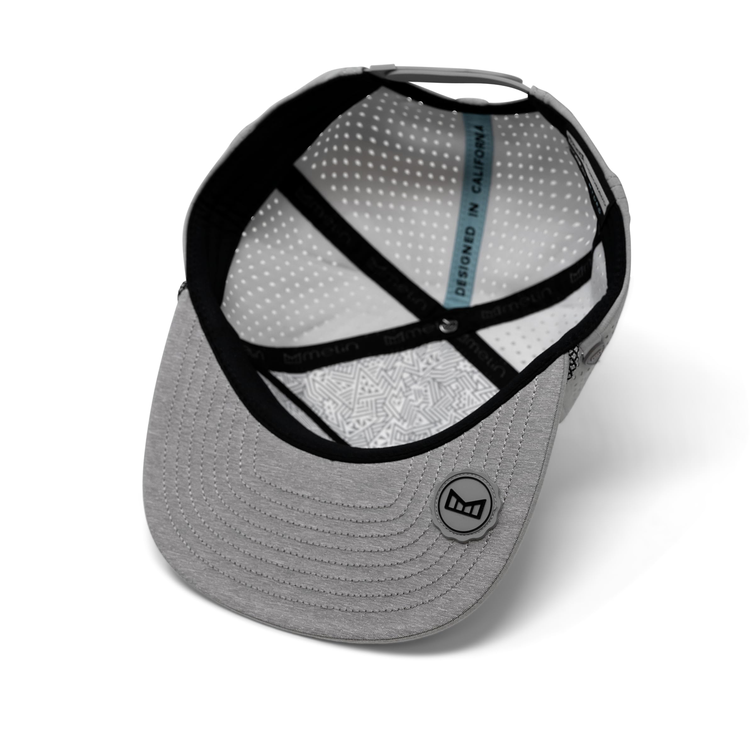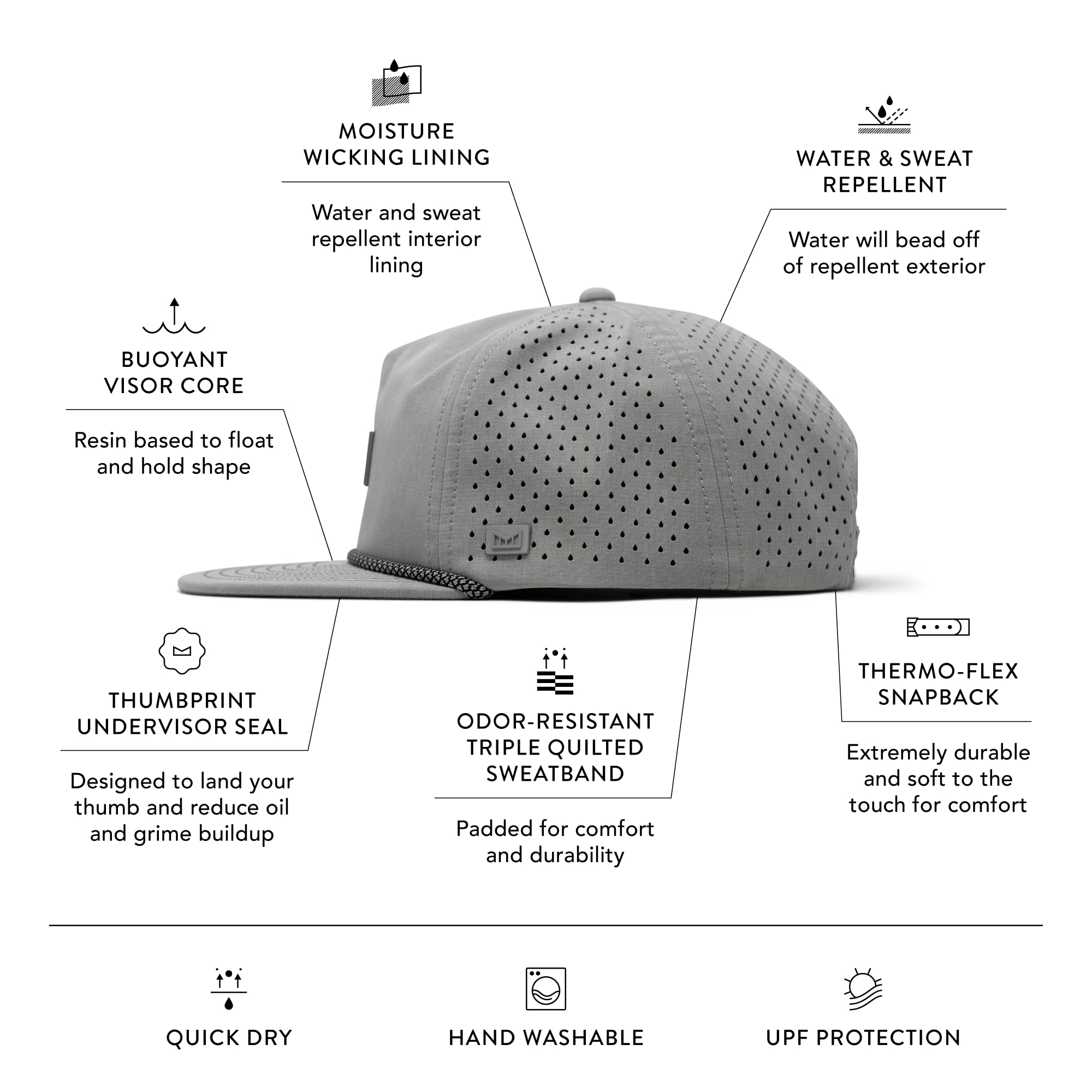 PERFORMANCE SNAPBACK HAT: Exterior crown has hydrophobic crown panels, laser-perforated side & rear panels for breathability, and custom soft touch snapback closure. Honeycomb Visor is designed for weight reduction and packability