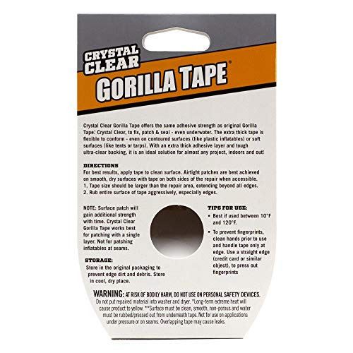 Crystal Clear Transparent Gorilla Duct Tape features the strength of Gorilla Tape, in a crystal clear tape that does not yellow outdoors. Made with a heavy duty adhesive layer and waterproof backing for extreme durability. This tape is UV and temperature resistant - great for projects and repairs both indoors and out. Crystal Clear Gorilla Duct Tape is best if used between 10°F and 120°F. To prevent fingerprints, clean your hands prior to using the tape and handle the tape only at edge. Use a straight edge (credit card or similar object), to press out fingerprints.For best results, apply the tape to a clean surface. Airtight patches are best achieved on smooth, dry surfaces with the tape on both sides of the repair (when accessible). Tape size should be larger than the repair area, extending beyond all edges. Rub the entire surface of the tape aggressively, especially the edges. NOTE: Surface patch will gain additional strength with time. Crystal Clear Gorilla Duct Tape works best for patching with a single layer. Not for patching inflatables at seams. Click on the Gorilla link at the top of this page to see other quality products from the Gorilla Glue Company.