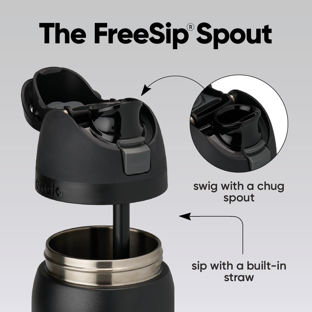 Patented FreeSip spout designed for either sipping upright through the built-in straw or tilting back to swig from the spout opening