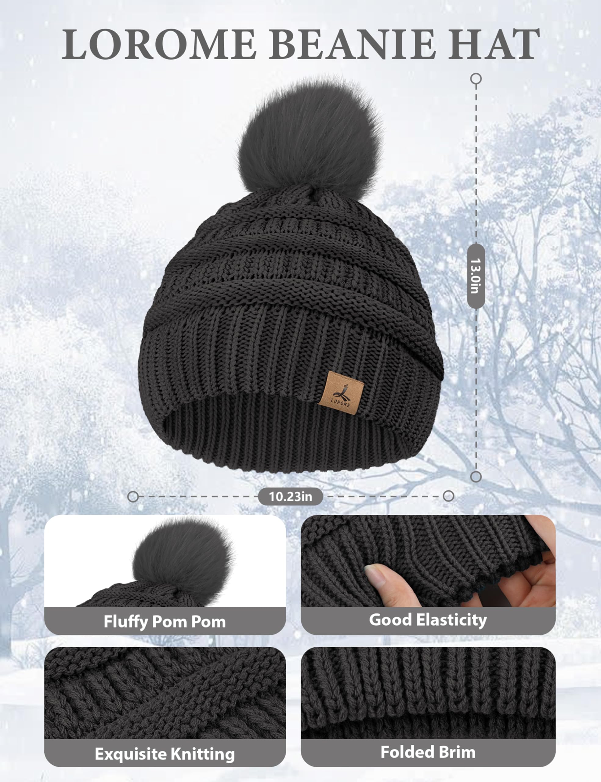 Exquisite Design - You may withstand the chilly weather in style by wearing the LOROME branded beanie set for women, featuring knitting tech, furry pom pom, dual layered and flanging brim design, thick cuff gloves with touchscreen design on thumb and index fingers.