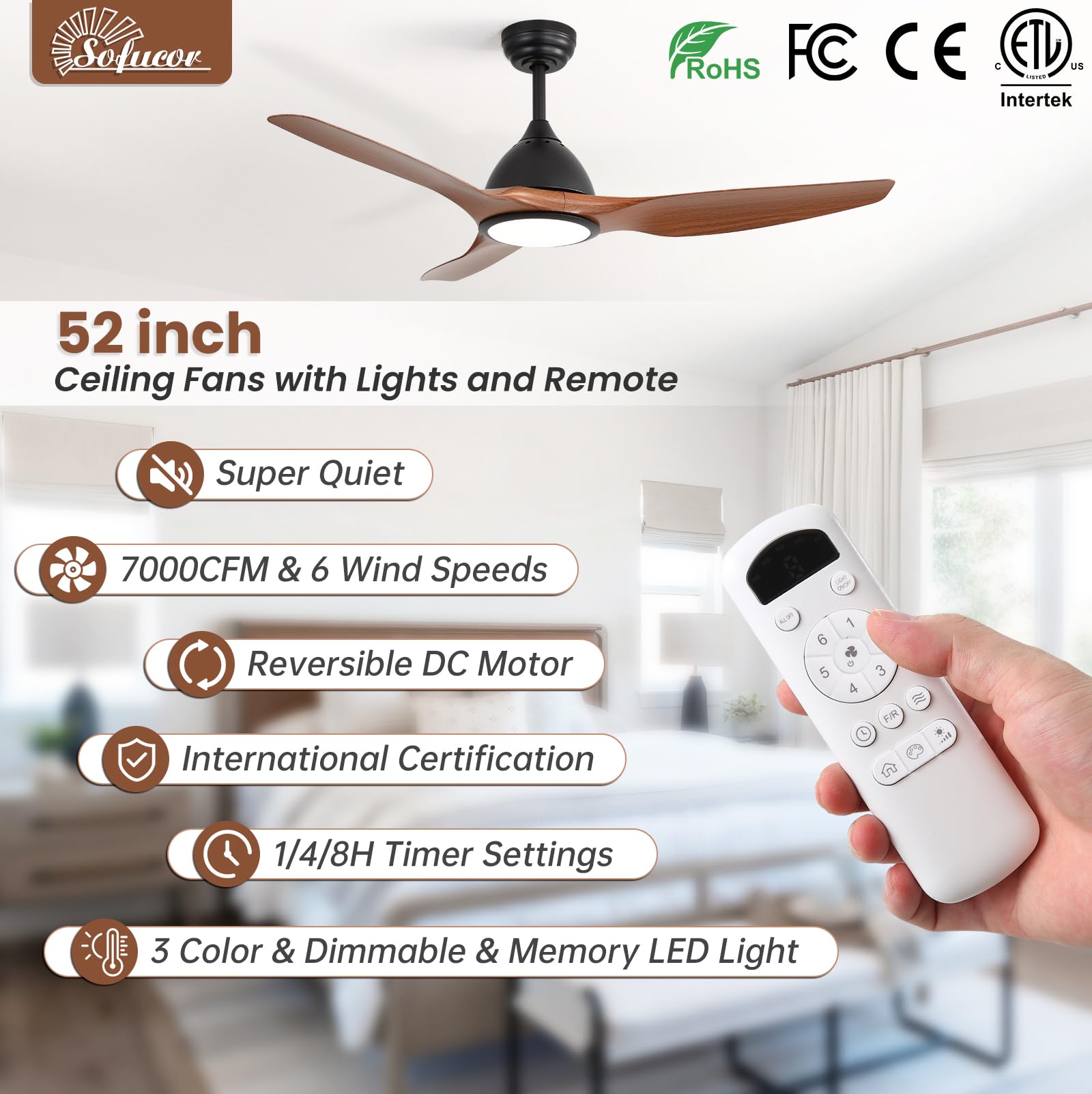 Sofucor 52 Inch Ceiling Fan Ceiling Fans with Lights, Modern, Large Airflow 7000CFM, with Remote, Dimmable, 6-Speed, 3-Timer, Reversible, DC Motor, Indoor Outdoor Living Room Bedroom