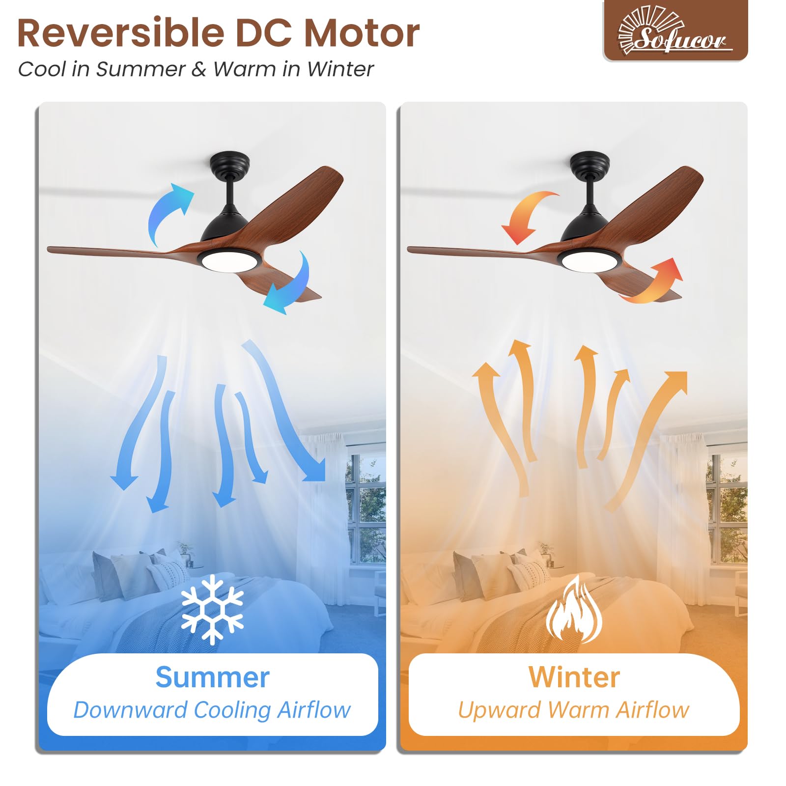 Quiet & Reversible DC Motor: Sofucor Bedroom ceiling fan features a cutting-edge DC motor that runs quietly (<30dB) and saves 65% energy than AC motors. Our 52 inch propeller ceiling fan with light features reverse airflow for both summer and winter use!