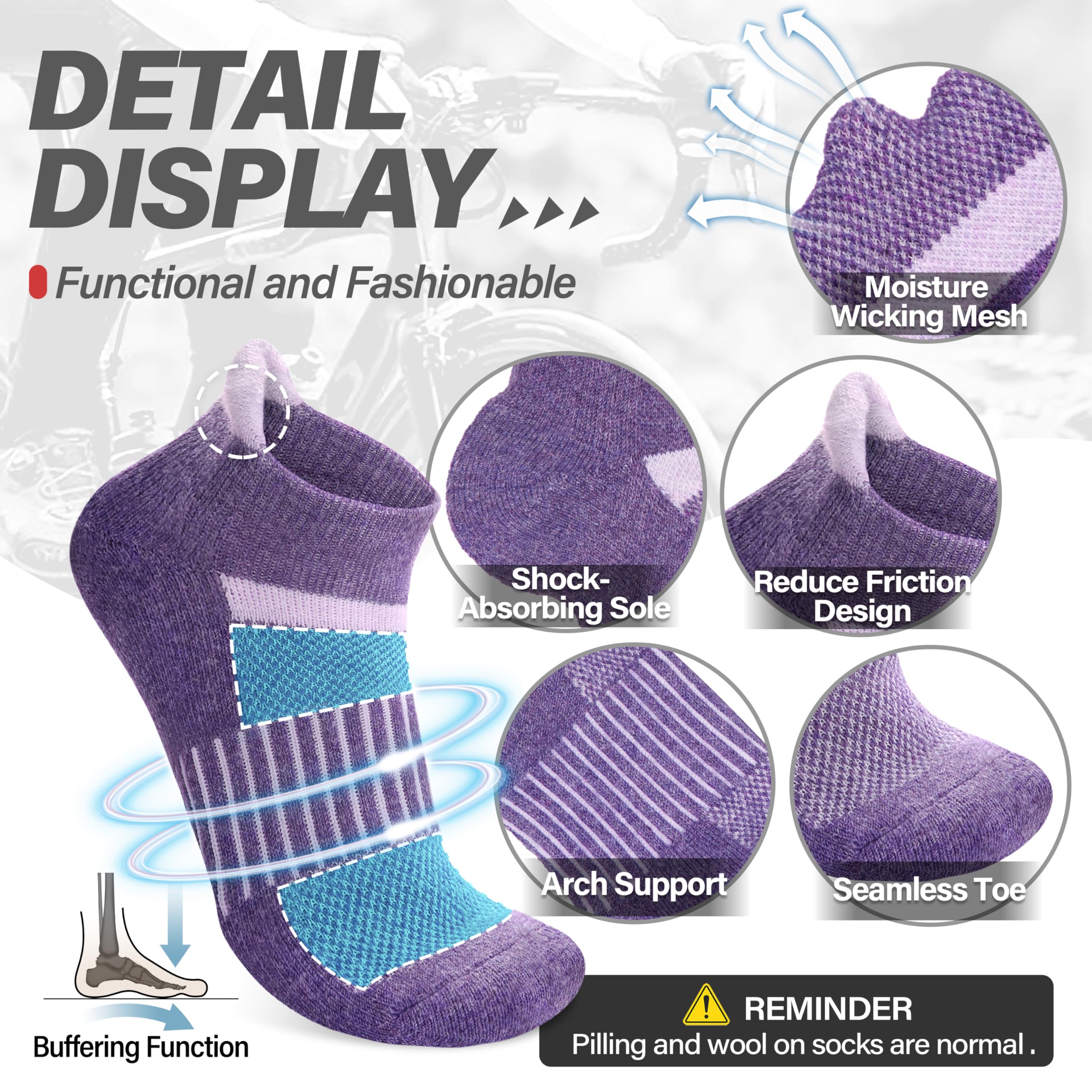 PROTECTION FOR FEET - These womens wool running ankle socks have stretchy cuff and arch support, which can have great compression support to reduce fatigue, protect the Achilles tendon, improve the blood circulation, and keep socks fit snugly. Cushioned sole absorbs shock and reduces risk of blistering. Pull tab resist abrasion and prevent slipping. All of these provide more protection for your feet.