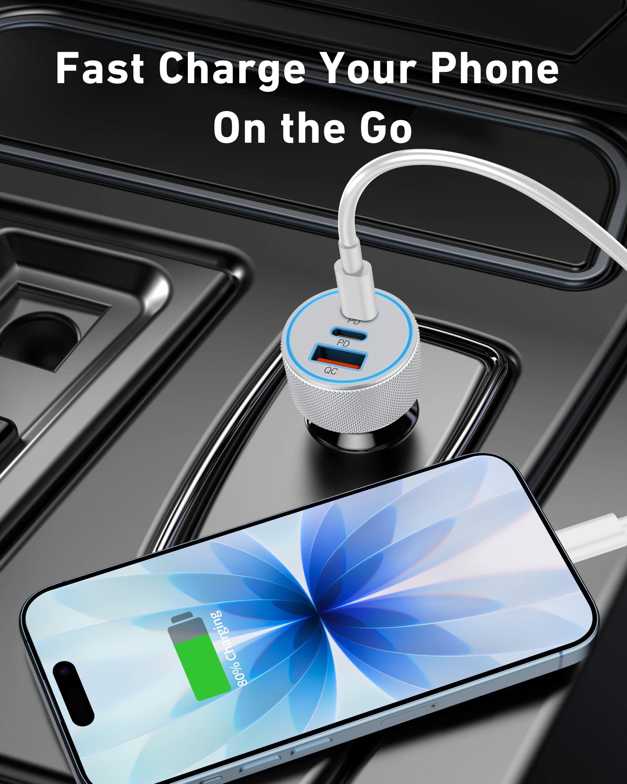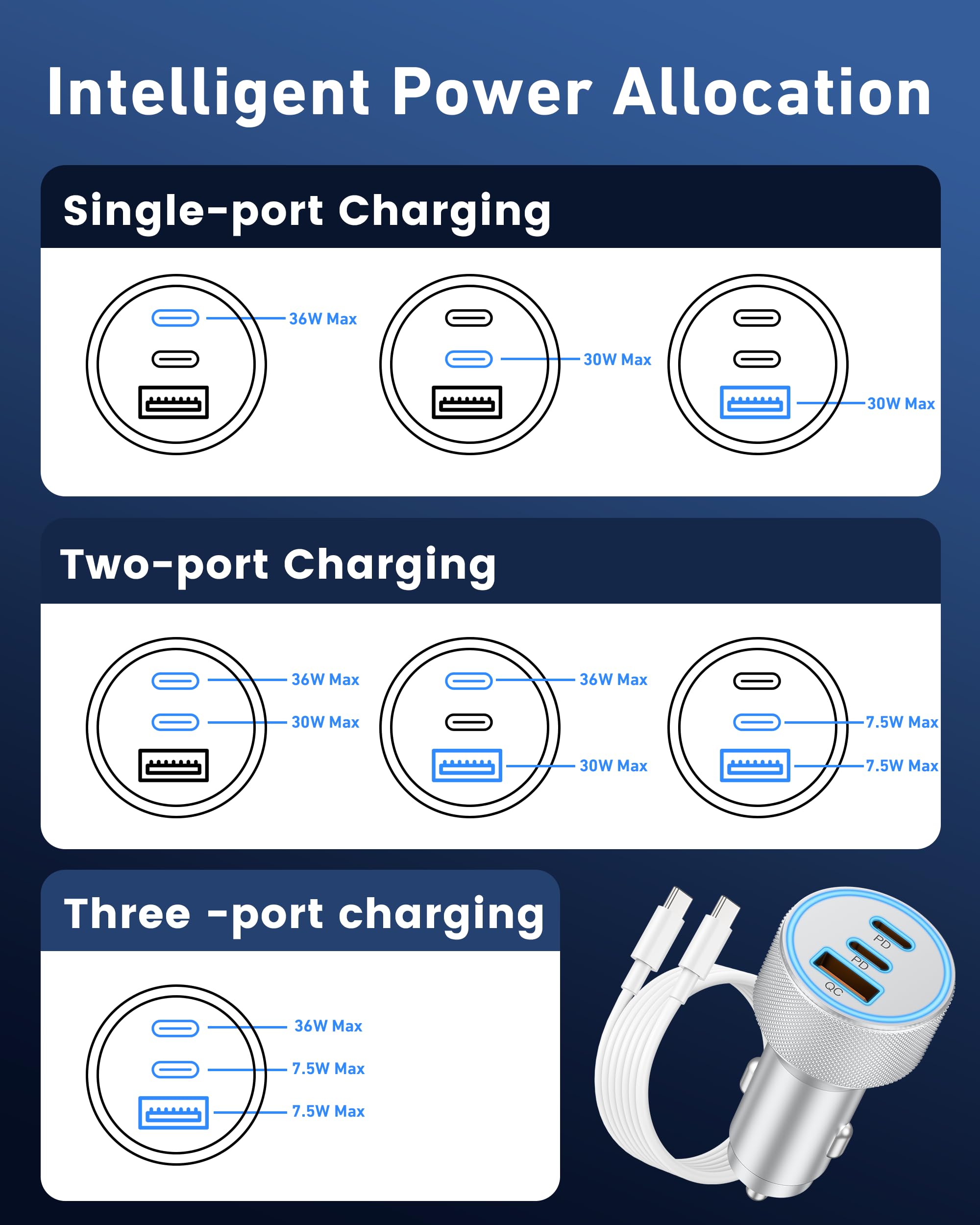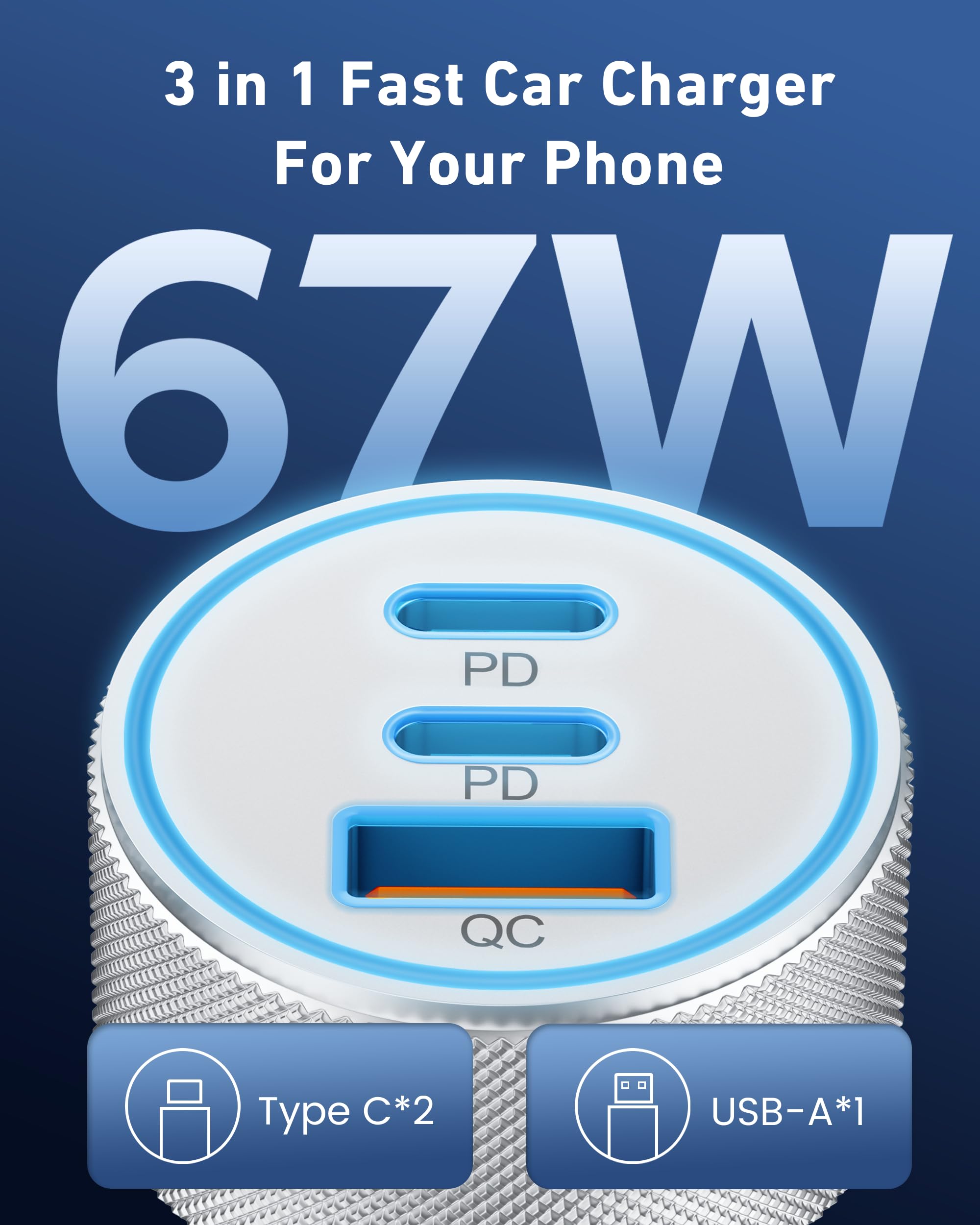 【67W 3-Port Super Fast Car Charger】 Total 67 Watt USB C car charger Support PD 37W Max (USB C) and QC 30W Max (USB-A) output, can fast Charge for Most USB-A and USBC Devices Simultaneously. One car charger for all your USB A & USBC devices, your ideal travel companion