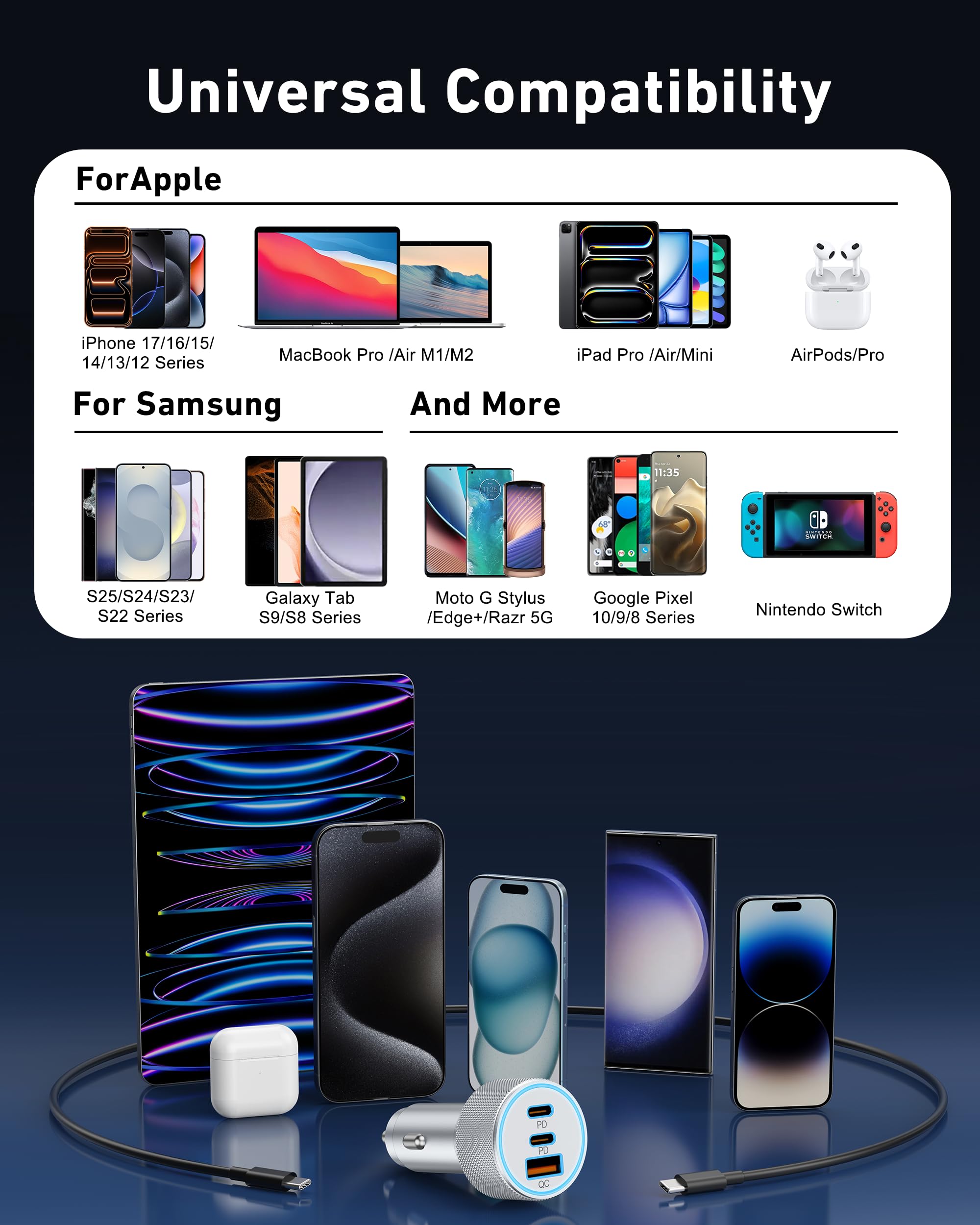 【Broad Compatibility】with USB-C and USB-A output, can charge almost all USB Devices, compatible with iPhone 17/17 Pro Max/17 Air, iPhone 16e, iPhone 16/16 Pro Max/16 Plus,iPhone 15/15 Pro Max/15 Plus, iPad, Samsung Galaxy S24/S23/S22/S21/S20, Note 20/10/9, Google Pixel 9/8/7/6/5, android Cell Phone and other devices