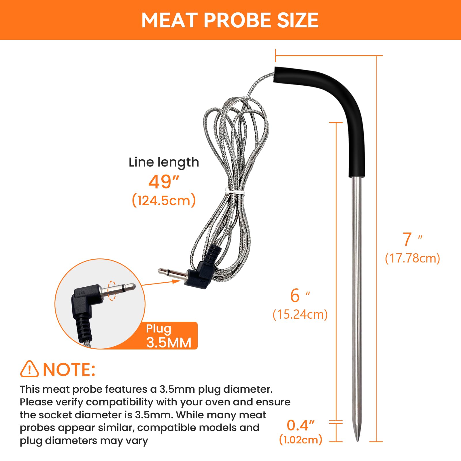3.5 MM PLUG: 3.5 mm plug thermometer probe for pit boss grill plug and play. The stainless steel probe section can be washed with water for cleaning. Note: This meat probe features a 3.5 MM plug diameter. Please verify compatibility with your oven and ensure the socket diameter is 3.5mm. While many meat probes appear similar, compatible models and plug diameters may vary