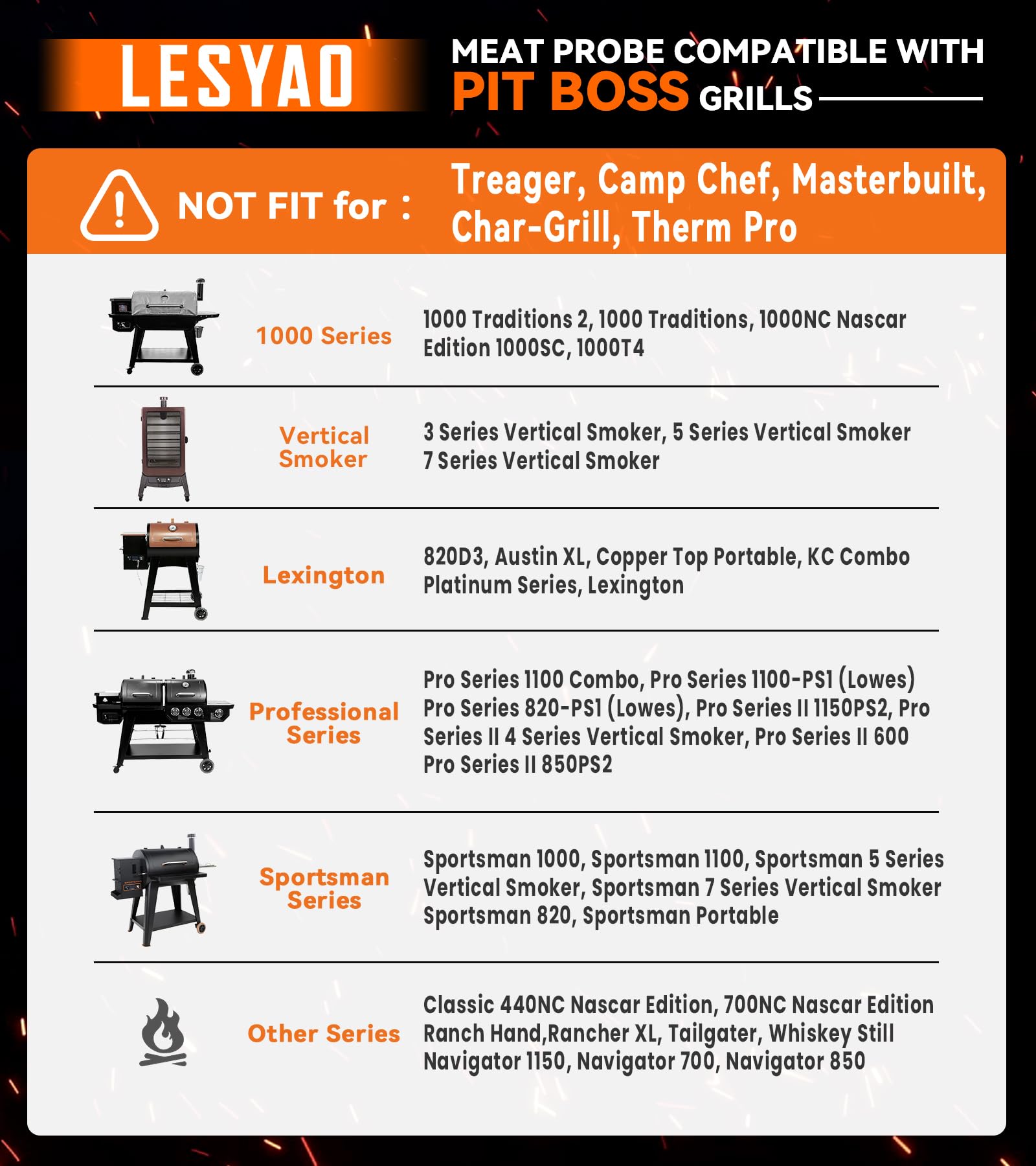 COMPATIBILITY: Meat probe is only compatible with Pit Boss wood pellet grills and smokers. NOTE: The Pit Boss probe NOT FIT FOR Treager, Camp Chef, Masterbuilt, Char-Grill, Therm Pro. Please ensure your grill is a Pit Boss and confirm that the model is compatible