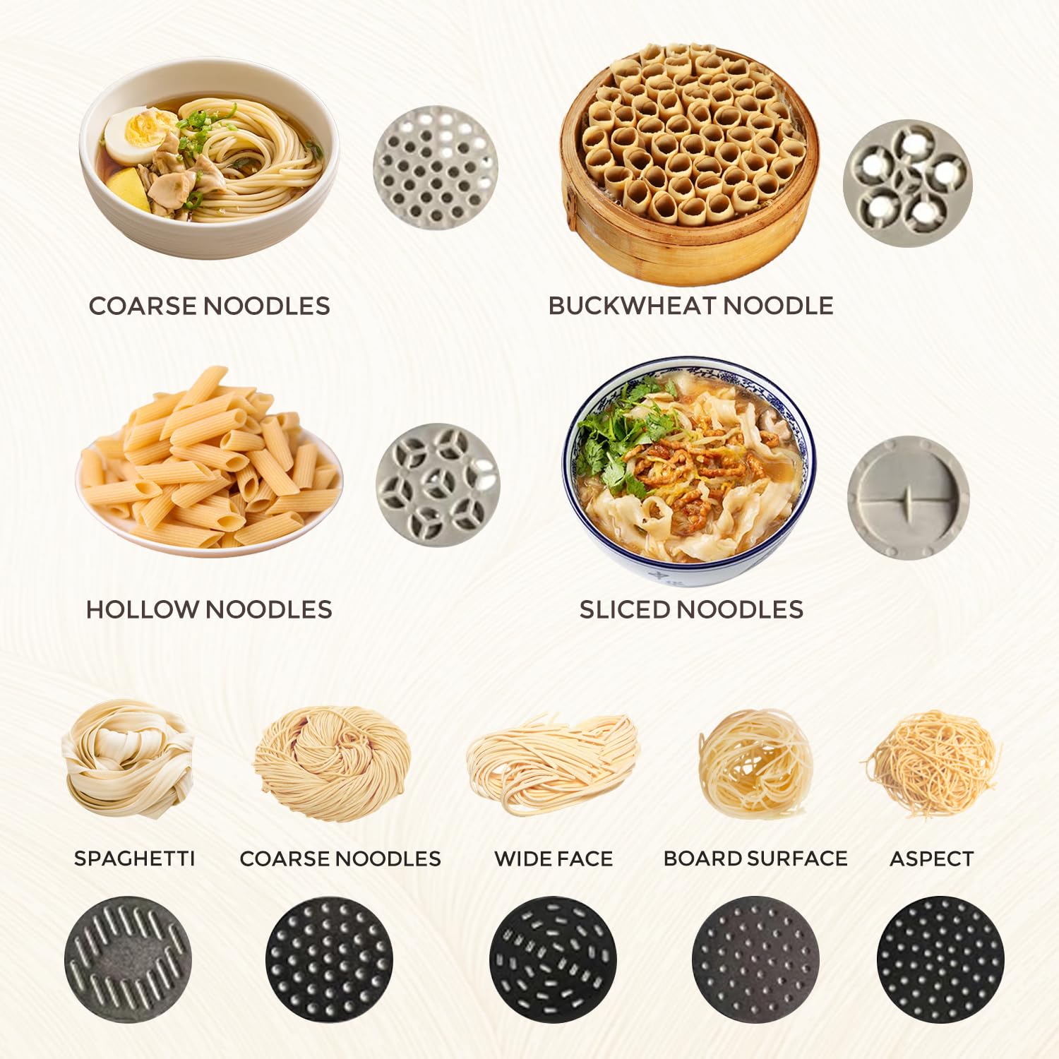 Easy to Use Pasta Maker: Our noodle maker is designed with user convenience in mind and can be operated in just a few simple steps. Select the appropriate noodle mold, place the dough in the machine, and press the button to start. The entire process is simple and easy to understand, requiring no complicated operations or tedious manual labor, allowing you to easily make perfect noodles.