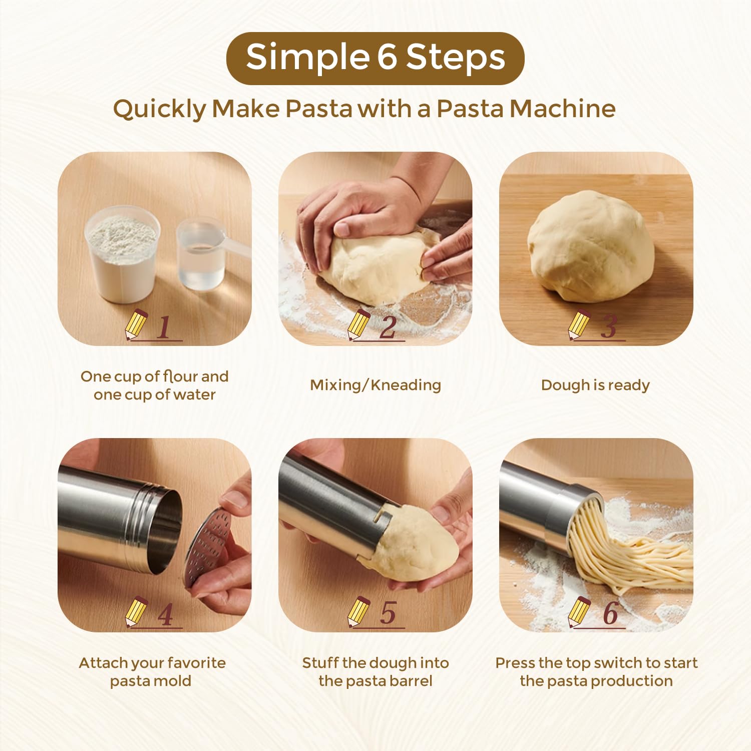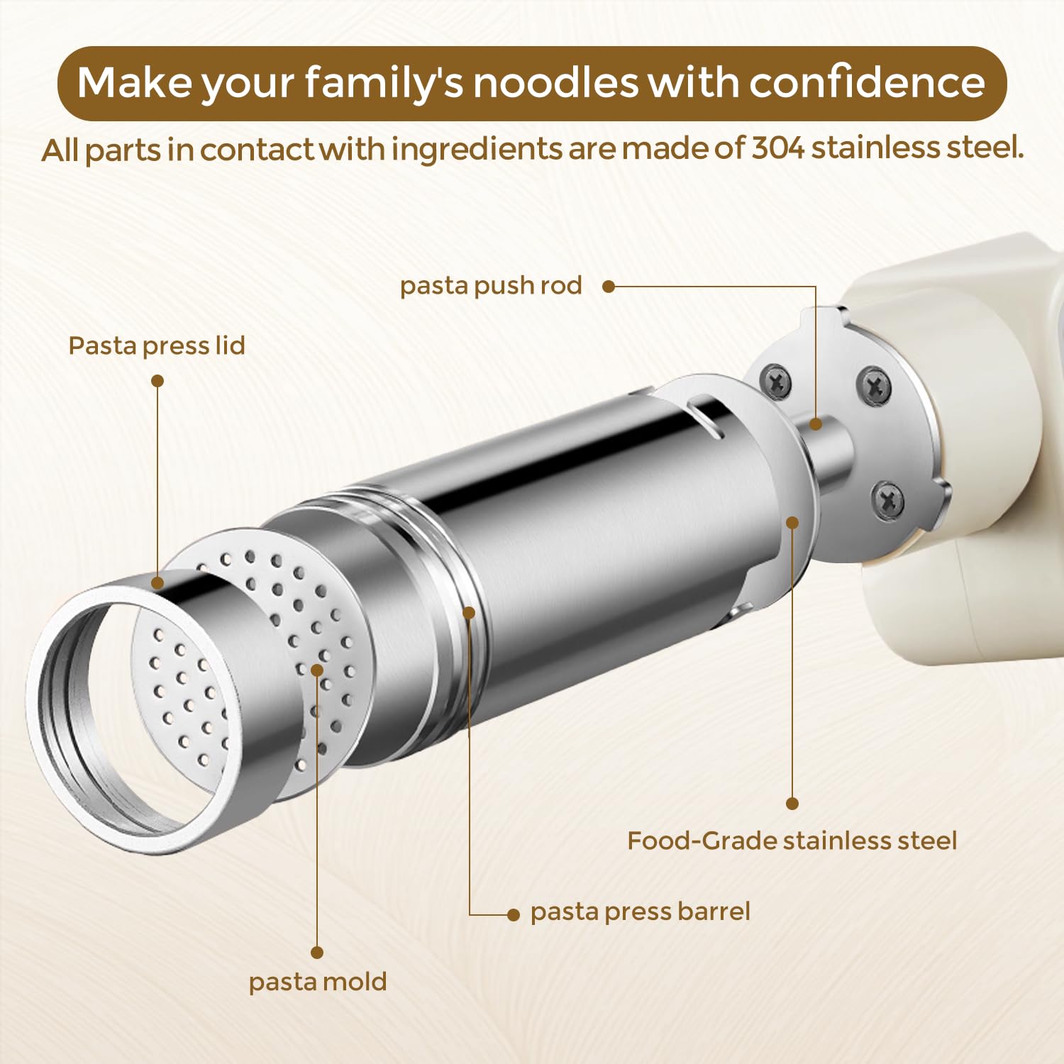 Food-Grade Safe Materials: The pasta tubes and molds of the automatic electric pasta machine are made of food-grade stainless steel, so there is no need to worry—just enjoy fresh homemade pasta that is safe for both children and health-conscious chefs. The sturdy, durable, and easy-to-maintain design gives you peace of mind, ensuring that every meal is consistently delicious.