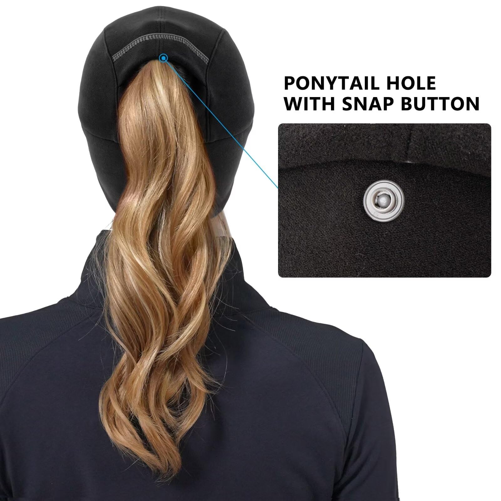 Reflective Ponytail Hat: The delicate ponytail opening can fit most ponytails and braids, does work best for high ponytails. If you don't tie a ponytail, you can snap the button inside for better warmth. Our reflective running cap has silver reflective stitching at the ponytail opening and a silver reflective accent around the visor cap’s brim, which can effectively improve the visibility in low light situations and improve safety