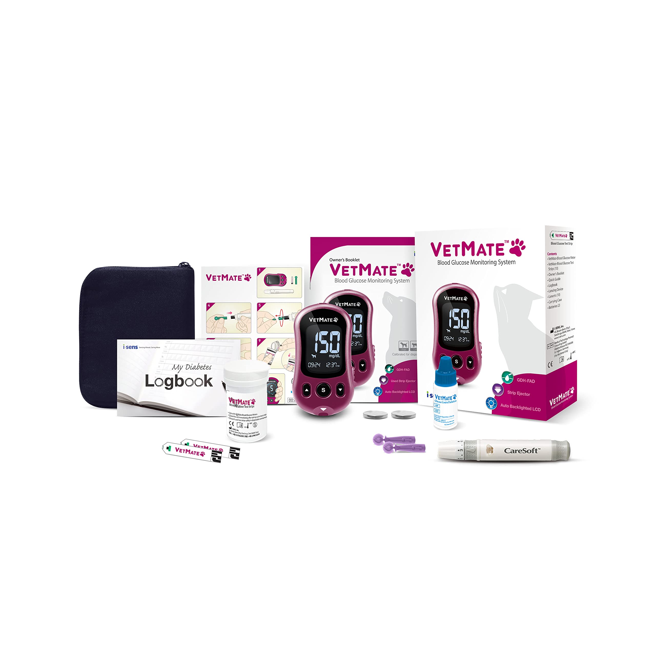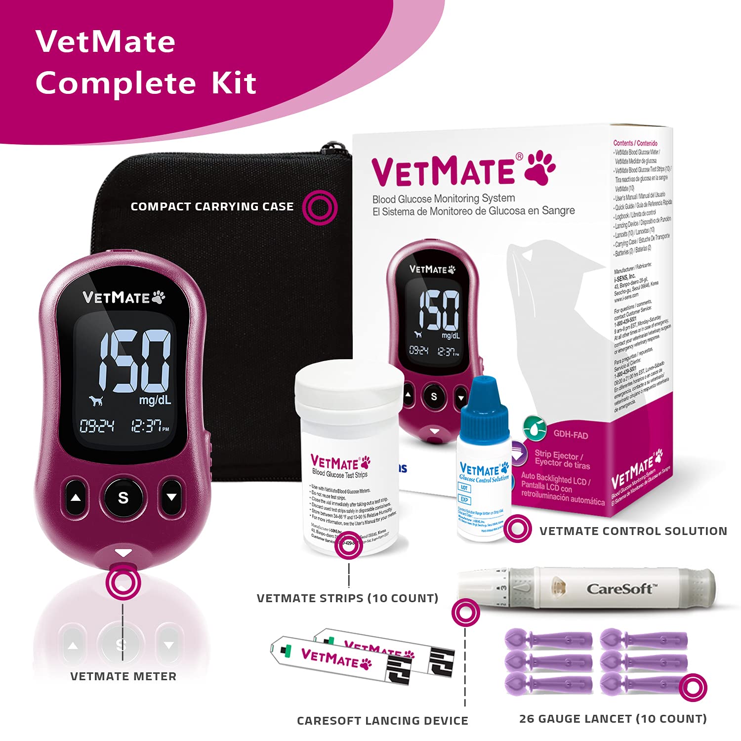 [Ready to test] – The Starter Kit has everything you need to start testing instantly. It includes the VetMate Blood Glucose Testing Meter, 10 Test Strips, 10 Lancets, 1 Lancing Device, 2 Batteries, Control Solution and a Carrying Case.