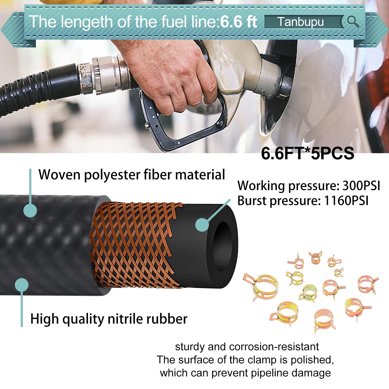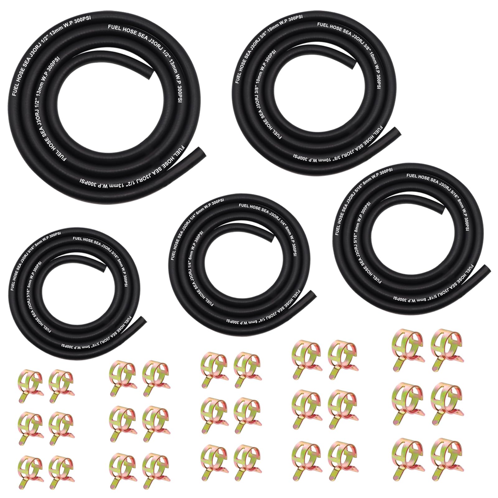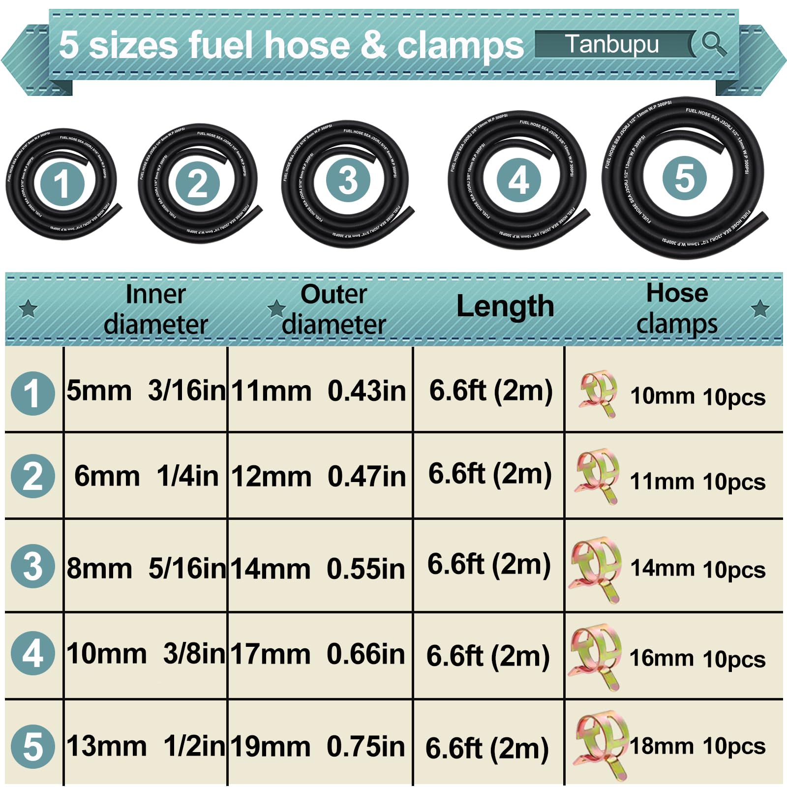5 Size Fuel Line Hose Kit with Heavy-Duty Clamps: 5 high-pressure fuel hoses (3/8",5/16",1/4",1/2",3/16" ID) ×6.6ft(2m)each + 50 hose clamps. Precision-labeled sizes for quick selection: 3/16"(5mm ID),1/4"(6mm ID),5/16"(8mm ID),3/8"(10mm ID),1/2"(13mm ID)