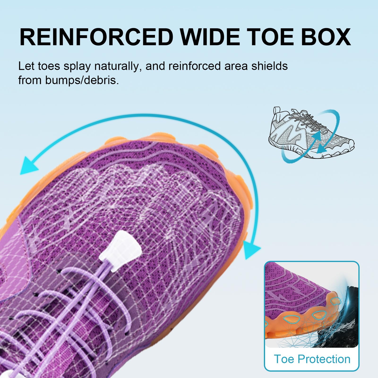 Wide Toe Box - Compared to the traditional trail running shoes, this women's barefoot shoe has a wider toe box design, which allows your toes to move and spread freely, promoting foot strength and flexibility. And this barefoot shoes has upgrade elastic drawstring allows you to quickly adjust the tightness of shoes and avoid the annoyance of tying your shoes.