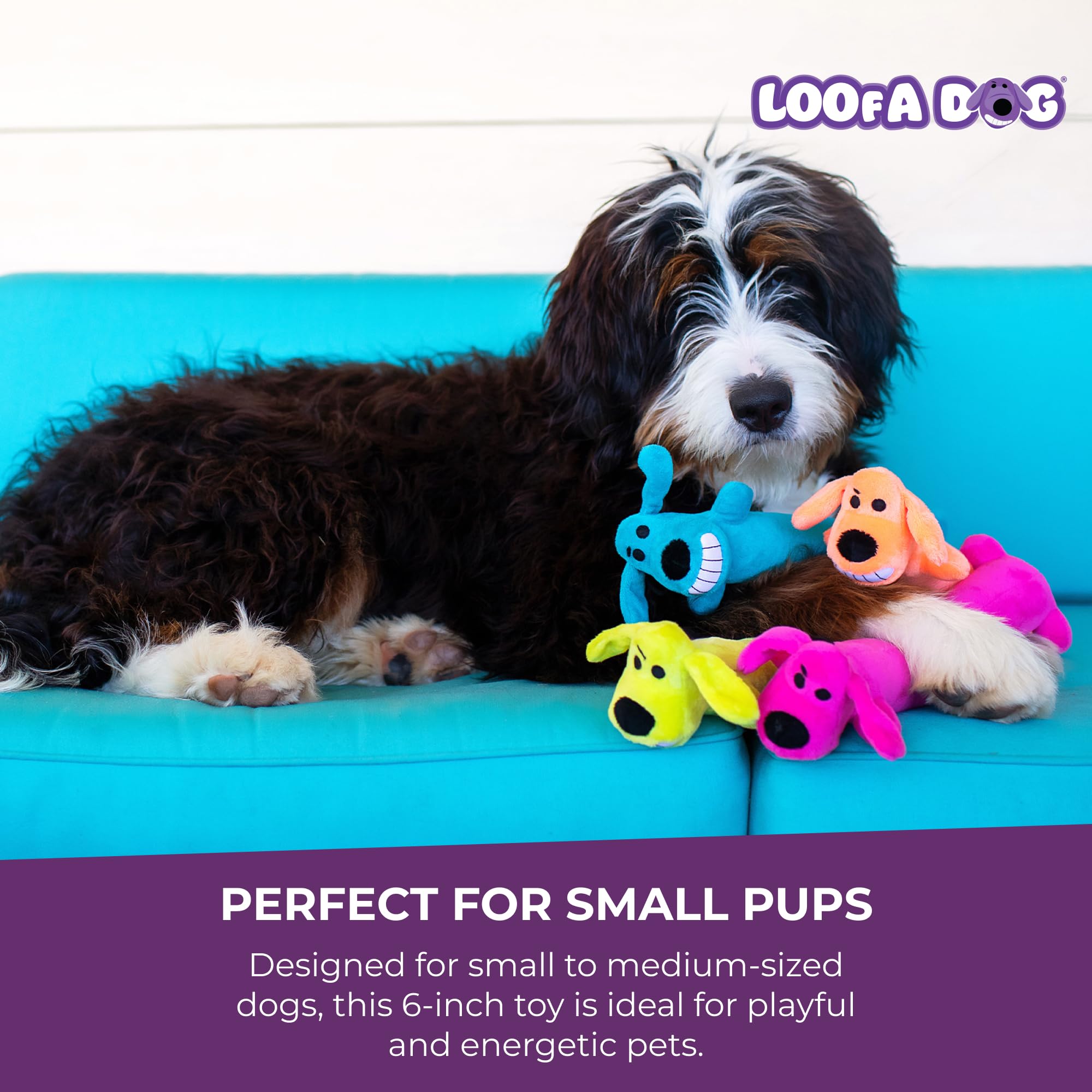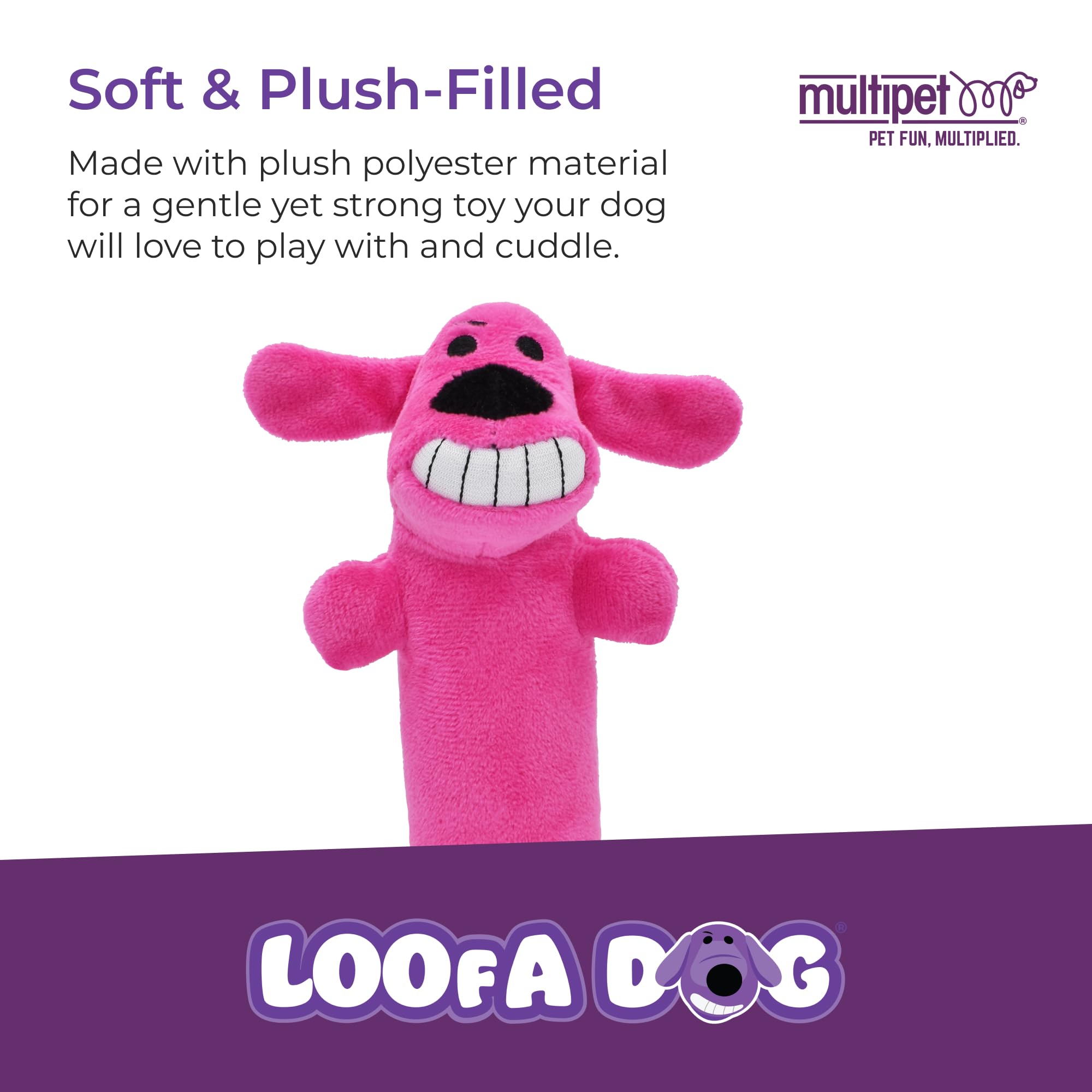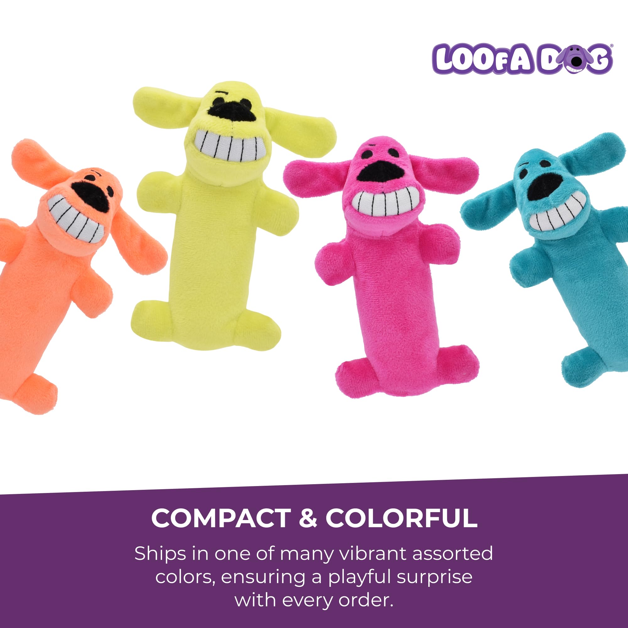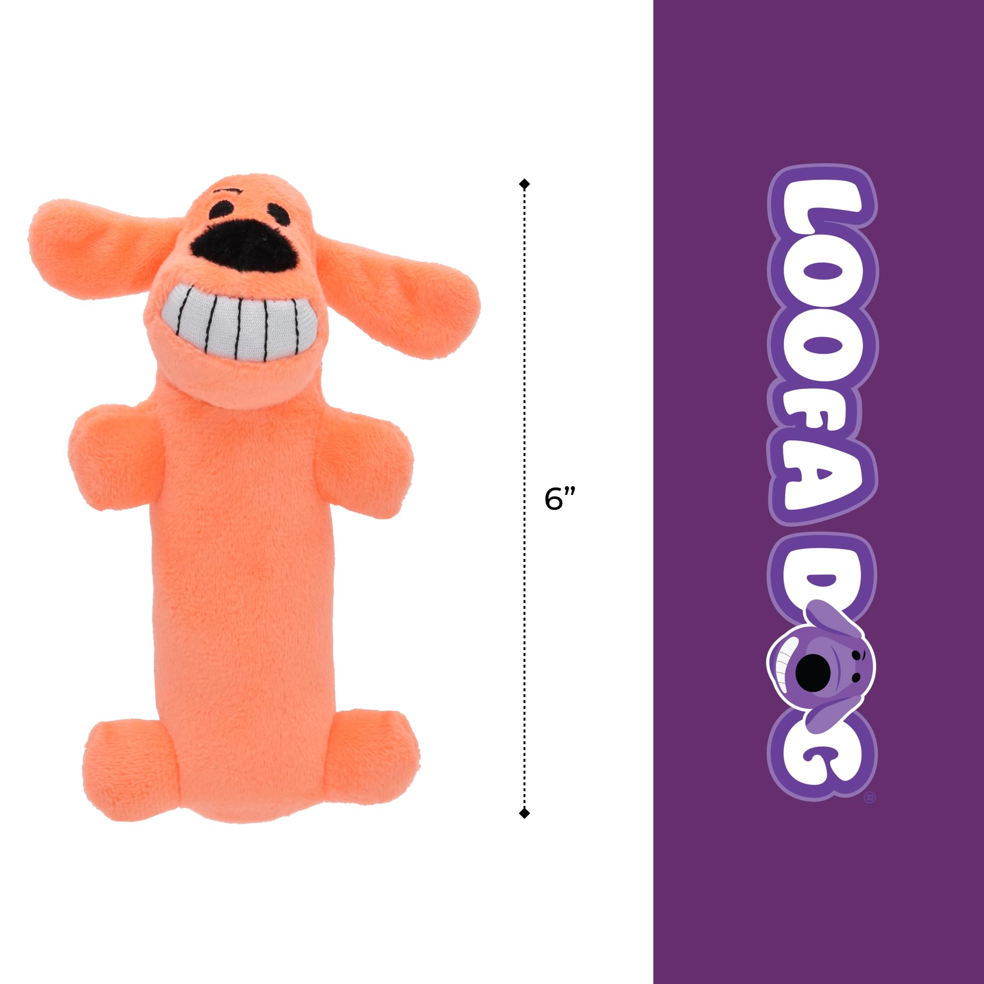 Multipet's 6 inch original loofa dog. This toy is great for small dogs and puppies. The mini loofa ships in assorted colors, but all are plush filled with a plastic noise maker.
