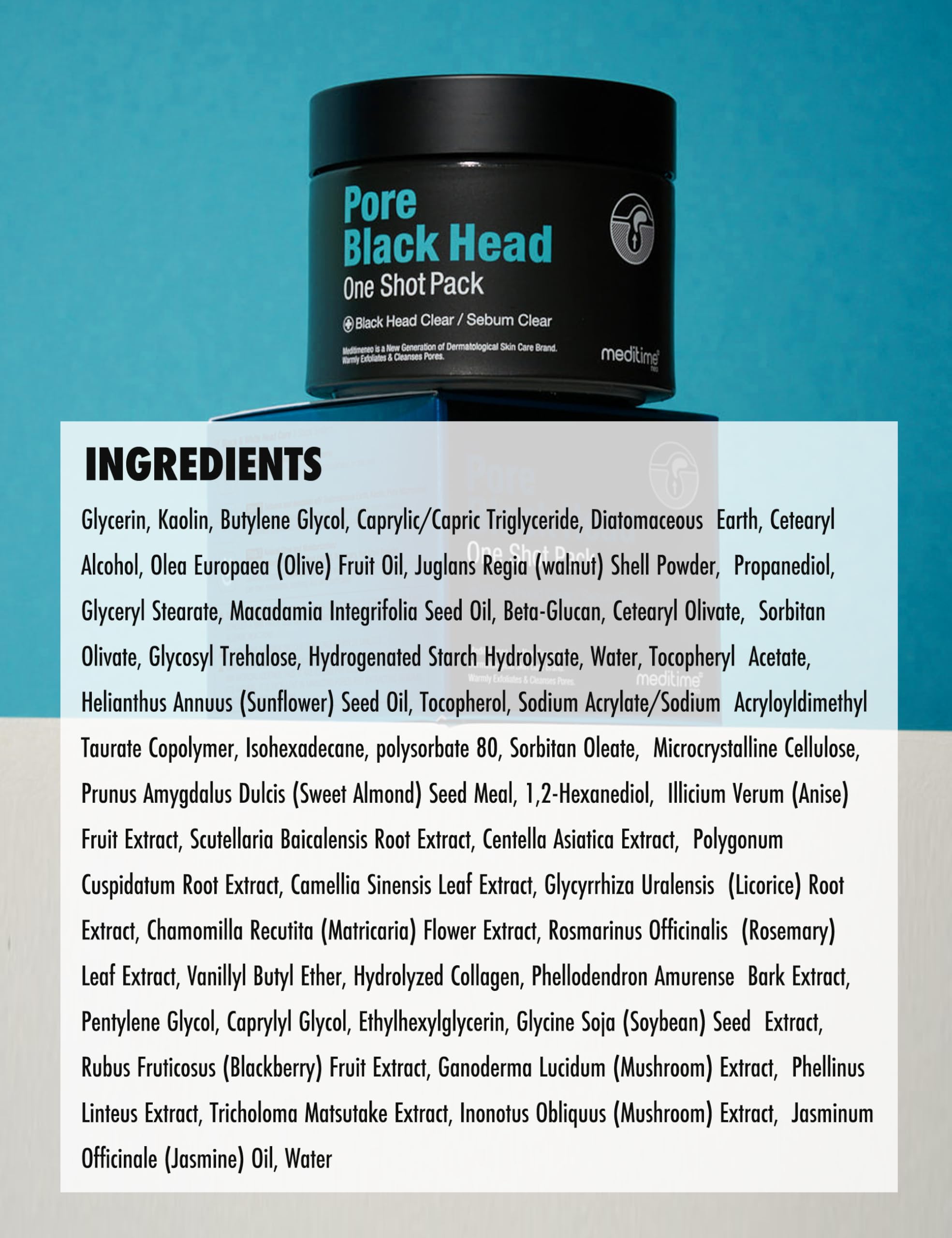 NOURISHING ESSENTIALS. MEDITIME Pore Blackhead One Shot isn't just a blackhead remover —it's a skincare powerhouse! Olive and Macadamia seed oils and Sunflower seed oil provide vital hydration and fortify your skin to foster a radiant glow.
