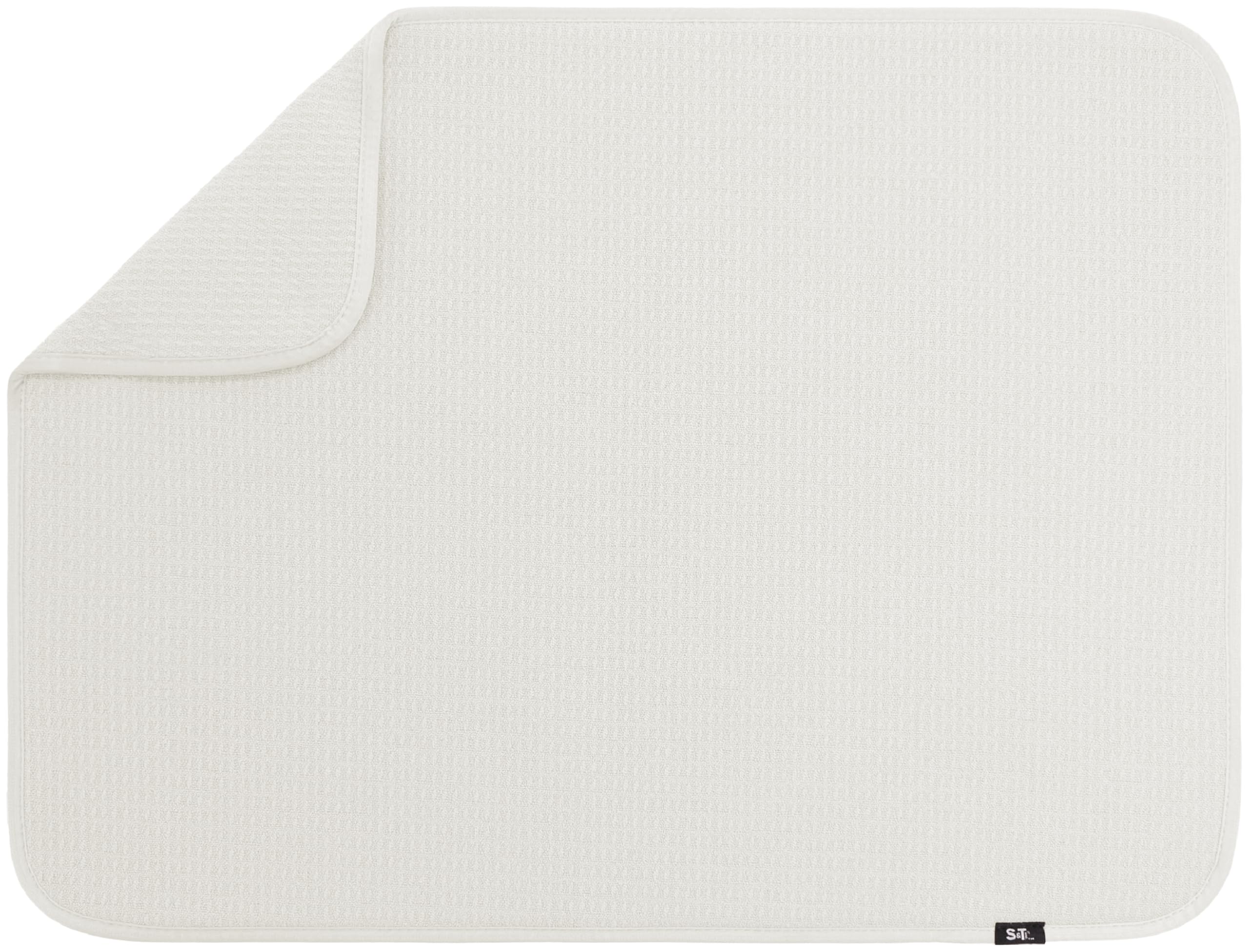 QUICK-DRY HANG TAG | EASY STORAGE: Our manufacturing process creates naturally strong and durable dish-drying mats . Fold up and toss in a drawer or tuck it elsewhere when not in use , and simply hang with the reinforced tag to dry . Our flexible core , folded between high-tech layers of microfiber , can go anywhere !