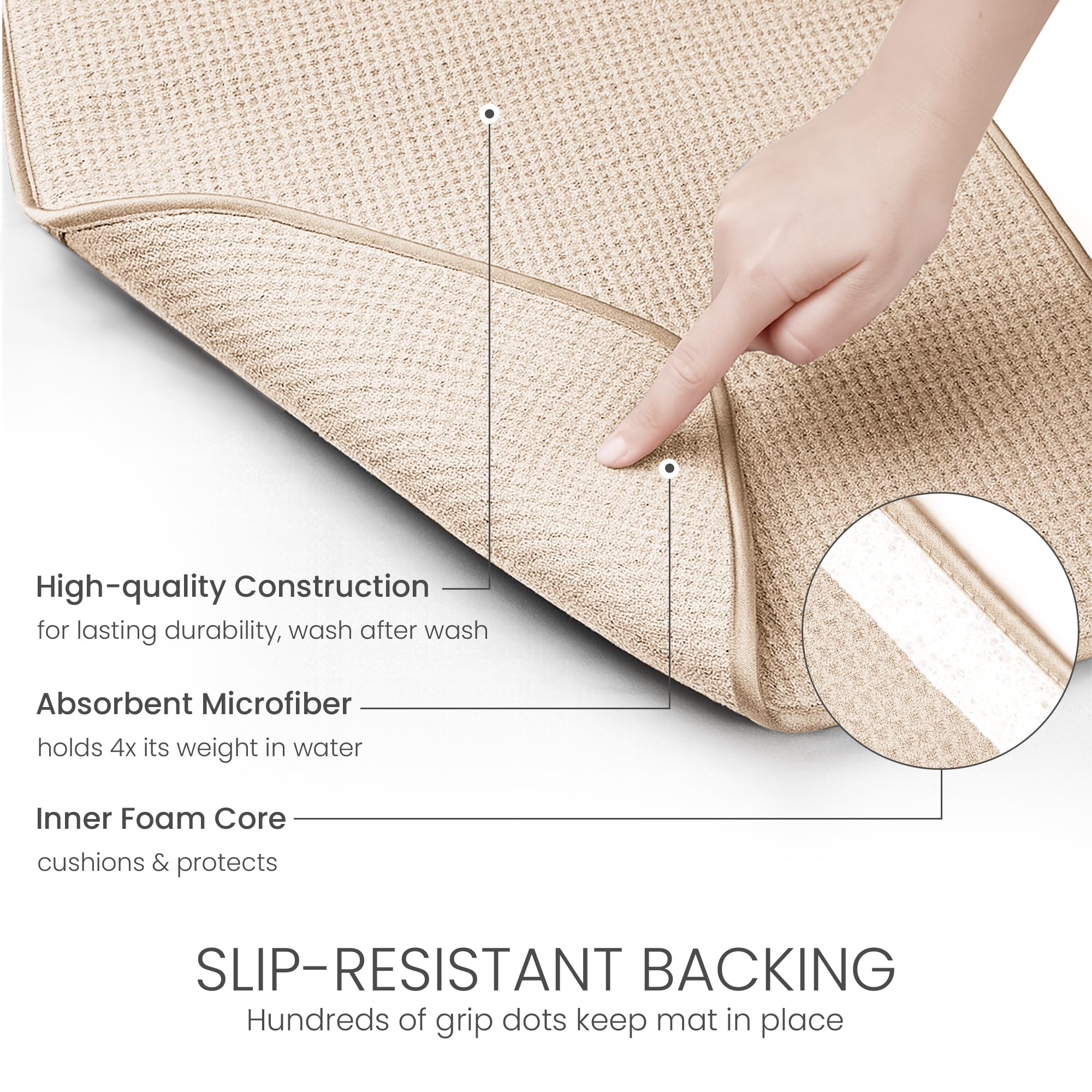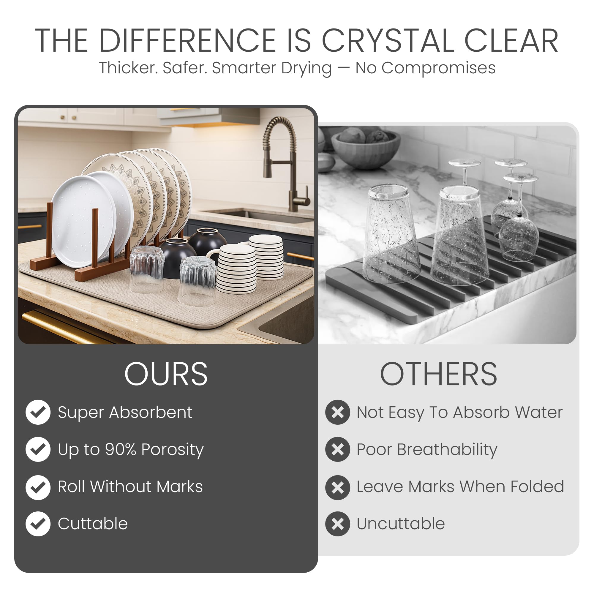 THICKEST , STYLISH MAT | INNOVATIVE HONEYCOMB WEAVE: Keep your counter spotless even while washing a sink full of dishes . Our superbly stylish drying mat is among the thickest on the market today , and its innovative honeycomb microfiber structure enhances absorption and quickens drying time .