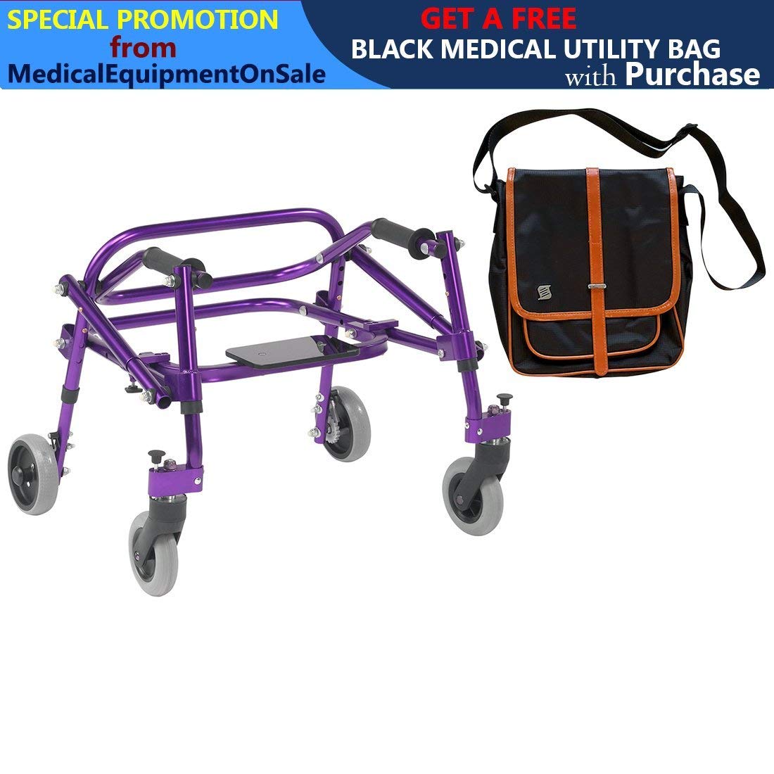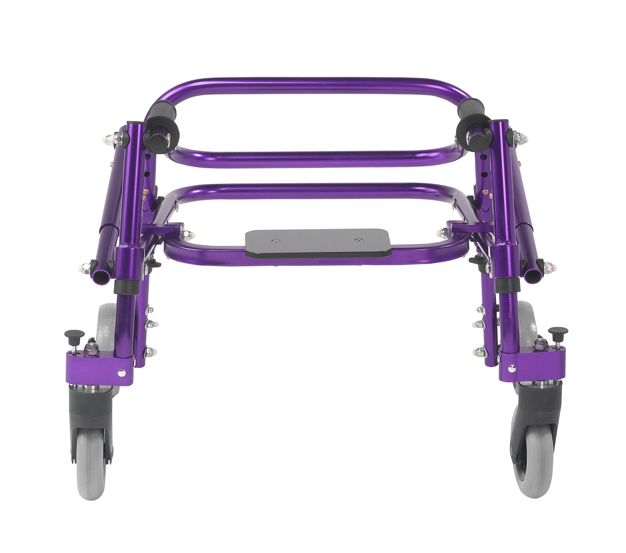 The Nimbo Posterior Walker provides maximum mobility assistance for both adults and children. Choose from five different height settings to experience the perfect customized fit. The Nimbo also features an improved handgrip design for increased comfort, and folds compactly for easy transport and storage. This Nimbo version includes a foldable seat that easily flips down for convenient rest stops, and flips back up to allow continued walking. Available in three new colors. Features and Benefits Height Adjustable Aluminum Frame Easily folds for transport Revised Hand grip design for increased user comfort Soft rubber wheels adhere to any surface and will not allow the Nimbo to slide backwards when using one-directional setting One directional 5" rear wheels with aluminum ratchet and pin mechanism for increased durability One directional override bracket to allow for two directional movement Easily switch from swivel to non-swivel front wheel settings Product Specifications Actual Product Weight: 14 lbs Handle Height (Max): 19.5" Handle Height (Min): 15.5" Inside Hand Grip Width: 13.5" Number of Wheels: 4 Overall Product Height: 15.5" Overall Product Length: 24" Overall Product Width: 20" Primary Product Color: Wizard Purple Primary Product Material: Aluminum Product Weight Capacity: 75 lbs Warranty: 1 Year Limited Model # ka1200s-2gwp