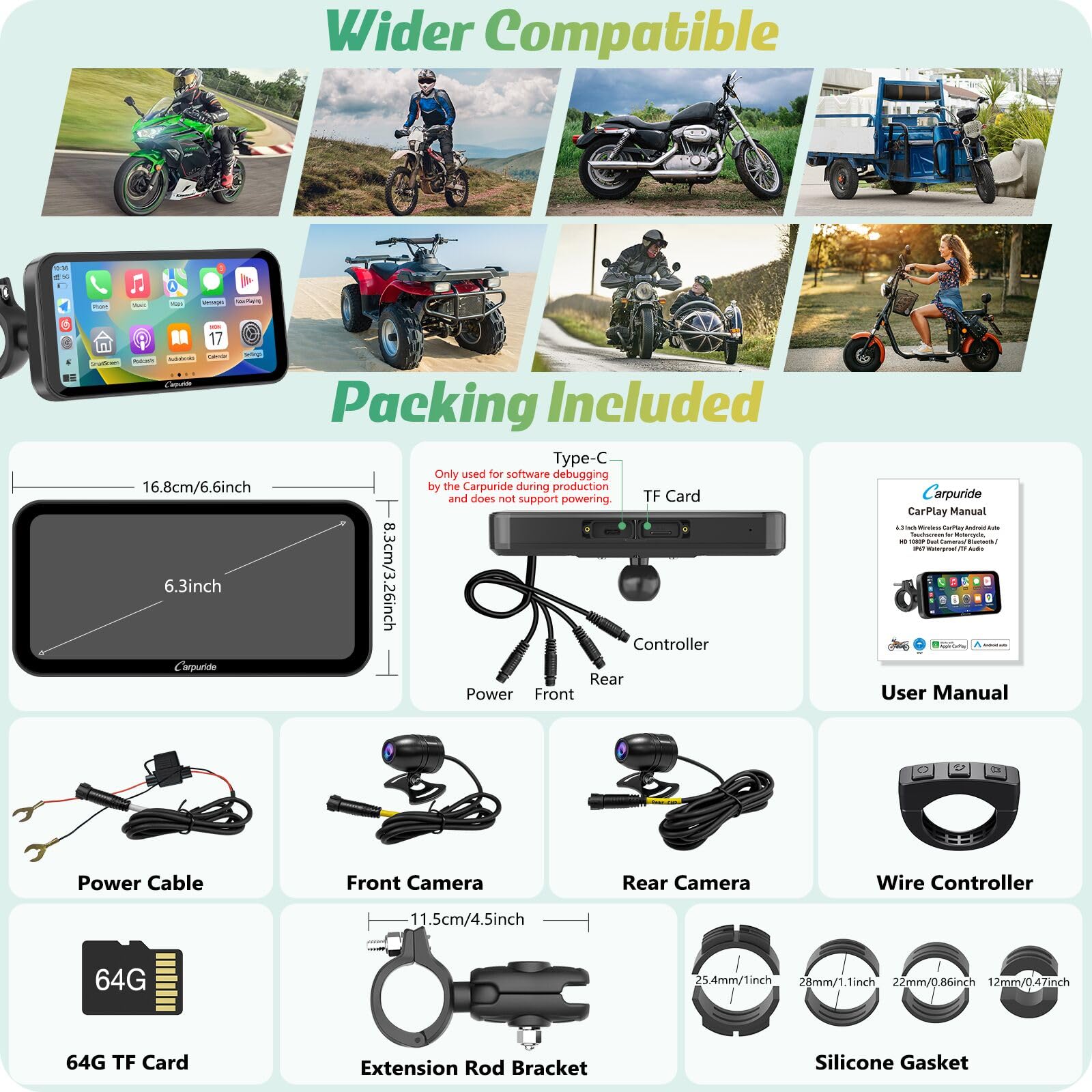 【Carpuride Motorcycle DVR Screen with Dual Cameras】6.3 inch moto screen is equipped with HD 1080P 30FPS 140° wide-angle front and rear cameras, allowing you to clearly see the road conditions in front and behind your vehicle, making driving safer. In DVR mode, it supports split-screen functionality, enabling simultaneous display of front and rear views. The package has a 64GB TF card, when it is full, it will automatically delete previous videos and continue recording.
