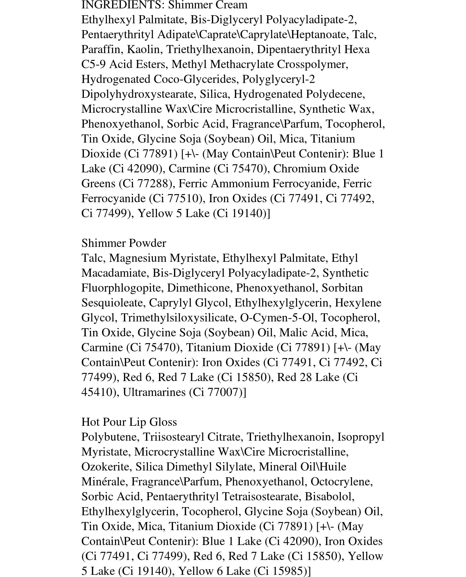 Have a beauty blast with this sweet beauty collection. This 25-piece collection includes 10 shimmer creams, 7 lip glosses, 3 shimmer powders, 3 applicators and 2 hair clips. The perfect assortment for a magical makeover!