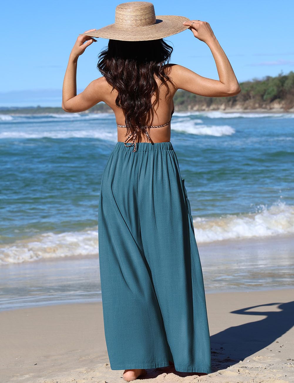 Style: Smocked Drawstring, wide leg, loose fit lounge pants with pockets, linen beach pants for women cover up, flowy dressy pants comfy and chic
