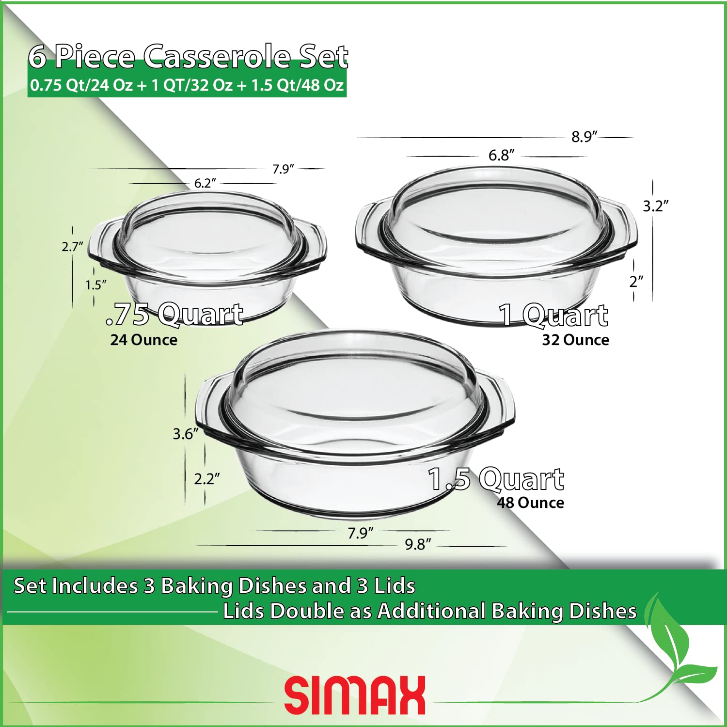 EASY COOK AND STORE: Casseroles can withstand temperatures between 572° and -40° Fahrenheit (300°/-40° Celsius). Use it to cook your food and then place the leftovers in the fridge or freezer for convenient storage. This set includes a .75 qt., 1 qt. and 1 ½ qt. casseroles. Microwave and dishwasher safe. Made from Cadmium and Lead-free recycled glass.