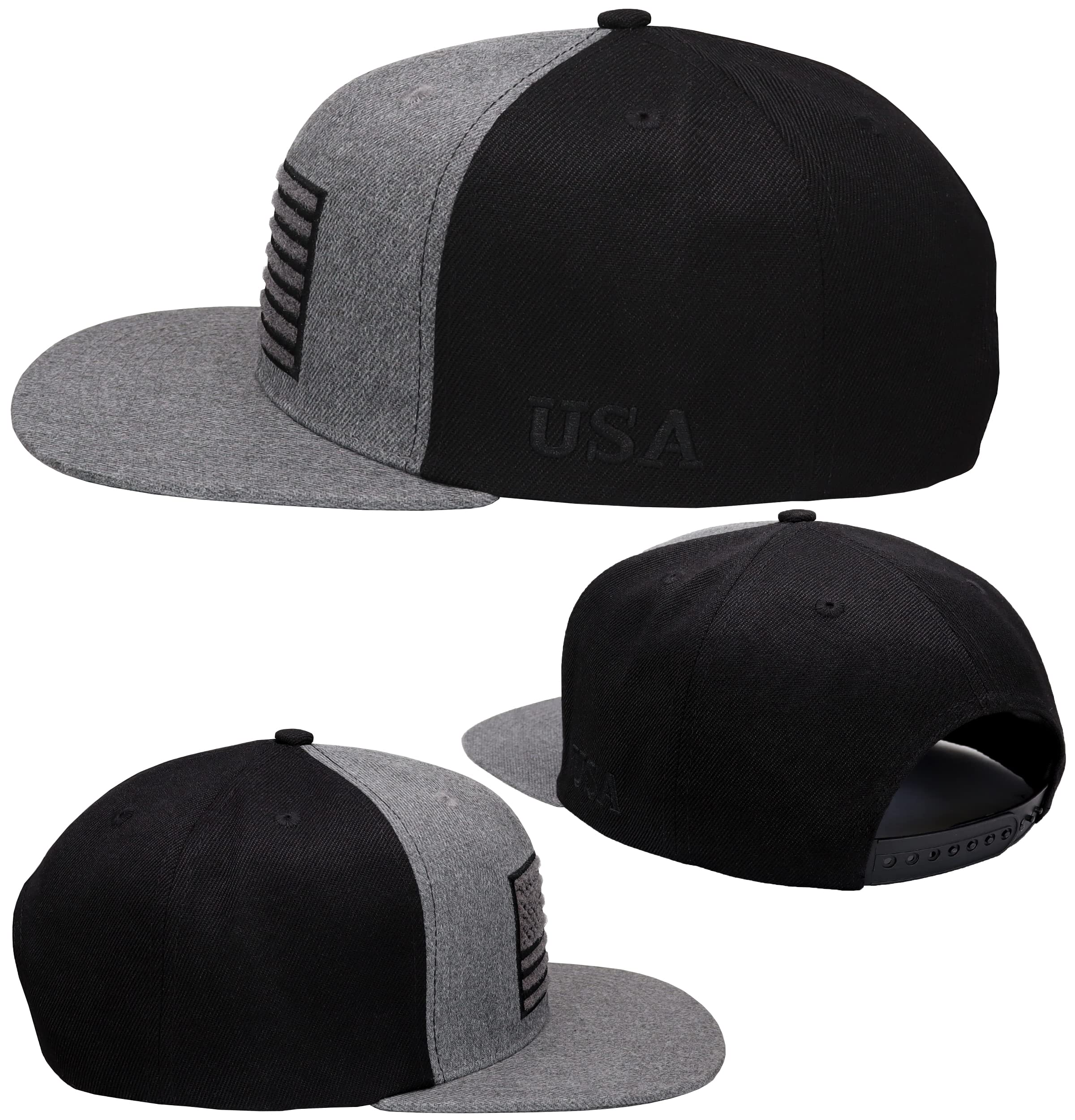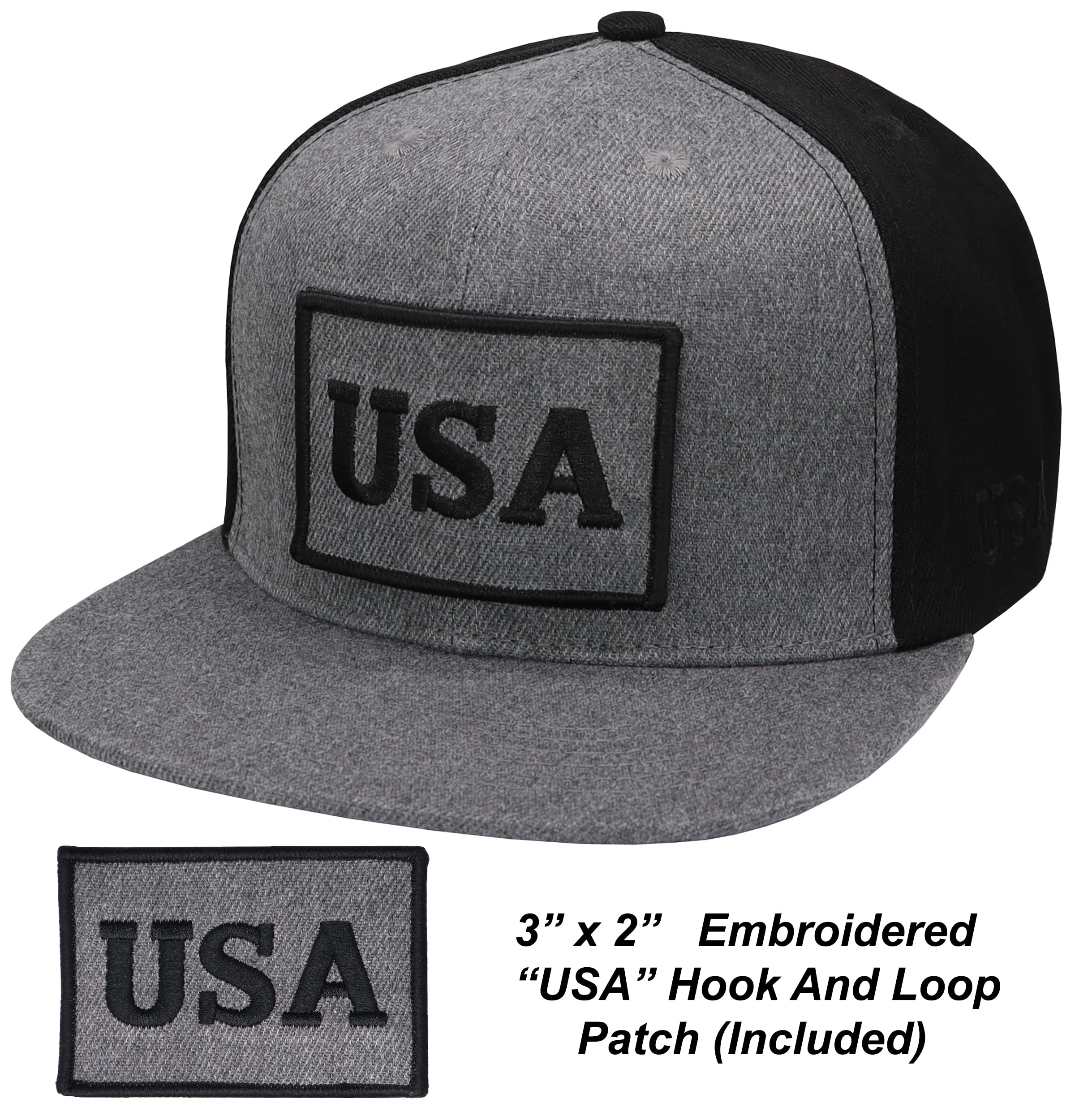 Great Look: Antourage flat visor hat features hook and loop embroidered flag on the front, which allows patch customization. Tonal "USA" embroidery on the left side. Convenient snap closure to custom fit the hat to your head. Great gift idea.