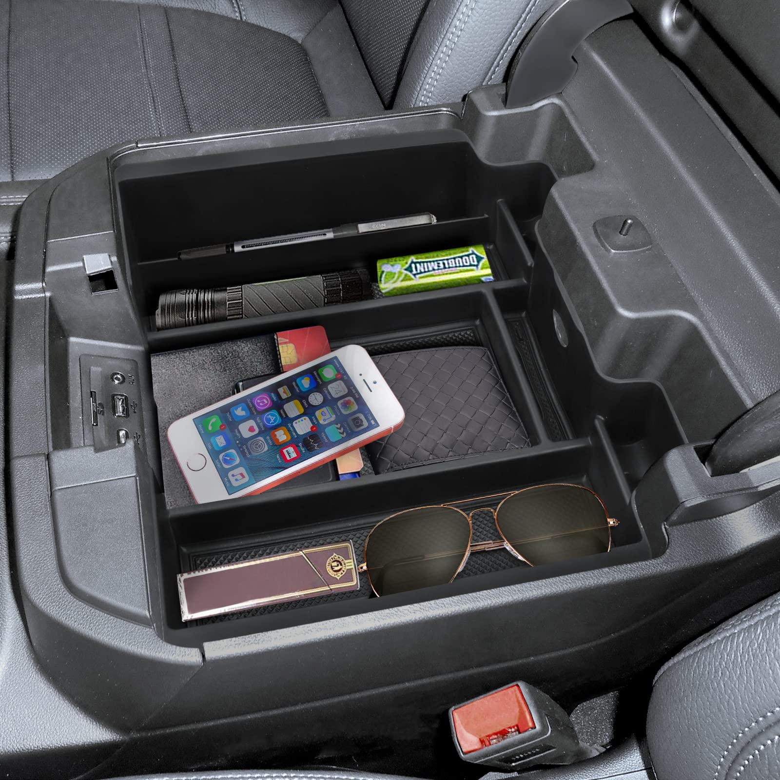 【Max Space】EAMPLEST console organizer maximizes the availability of your armrest storage space, suitable for storing your essentials in this full-size tray (phone, lipstick, change, notepad, sunglasses, business cards etc.) and storing anything that doesn't commonly used things are used below.essential Silverado/Sierra accessory for trucks