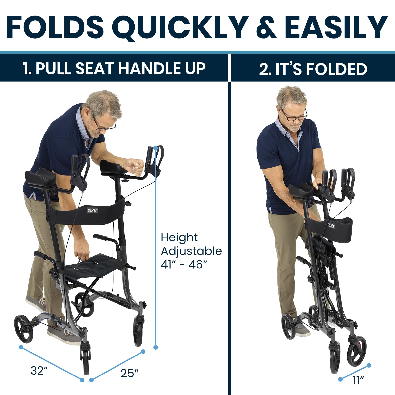 IDEAL FOR HEIGHTS 5'2" - 6'4": Locking push pins allow the height of the Vive upright rollator walker handles to be easily adjusted from 45” to 52” in height (ideal for heights 5'2" to 6'4"). The folding walker handles are topped with contoured armrests to evenly distribute pressure, relieving fatigue and length adjustable hand grips with easy to use loop brakes to lock the wheels in place for stable seating.