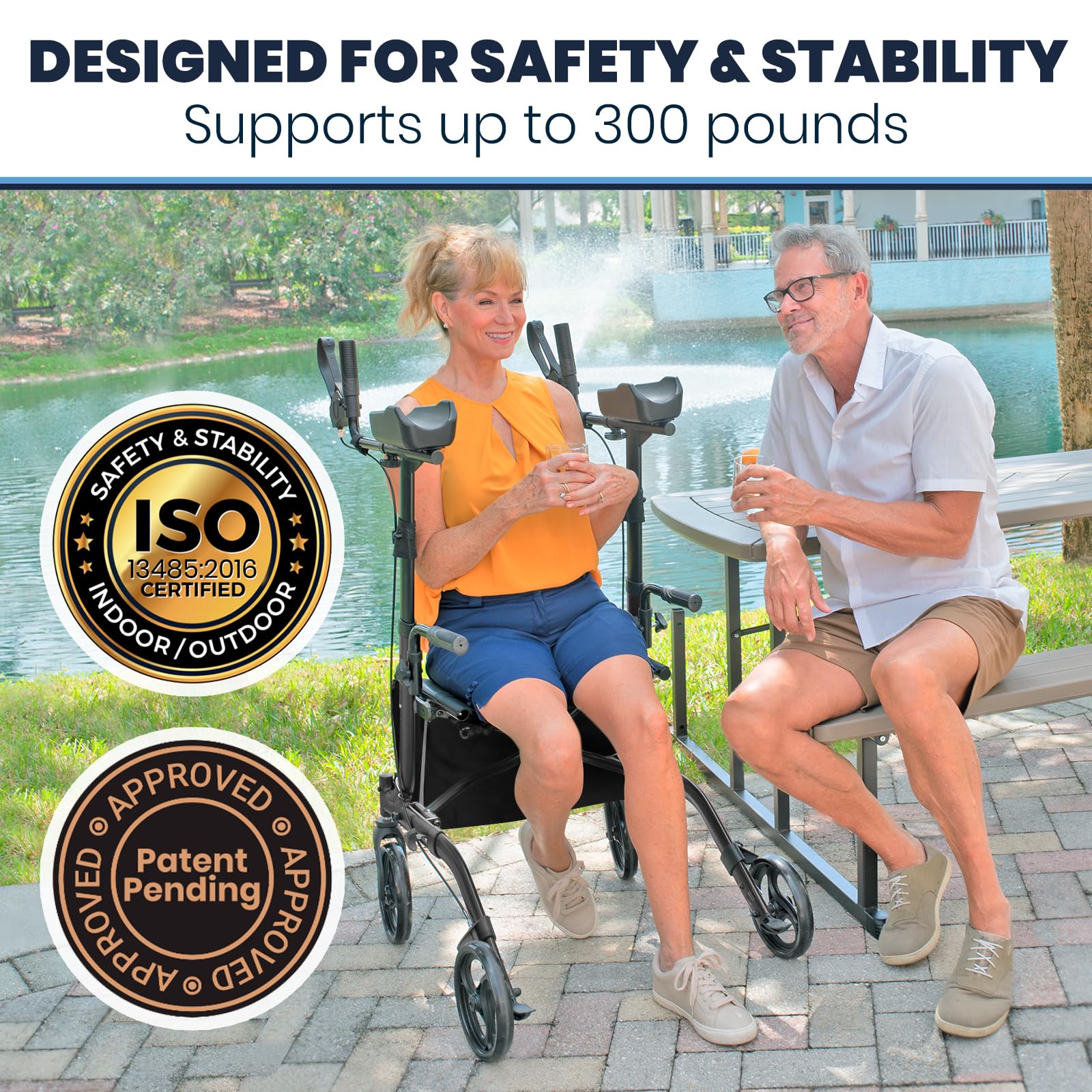 COMFORTABLE ON THE GO SEATING: Featuring a supportive, 17.5” wide seat, the tall upright rollator walker provides comfortable, on-the-go seating for resting as needed. The folding rollator also includes a detachable shoulder bag that safely stores essential items close at hand.