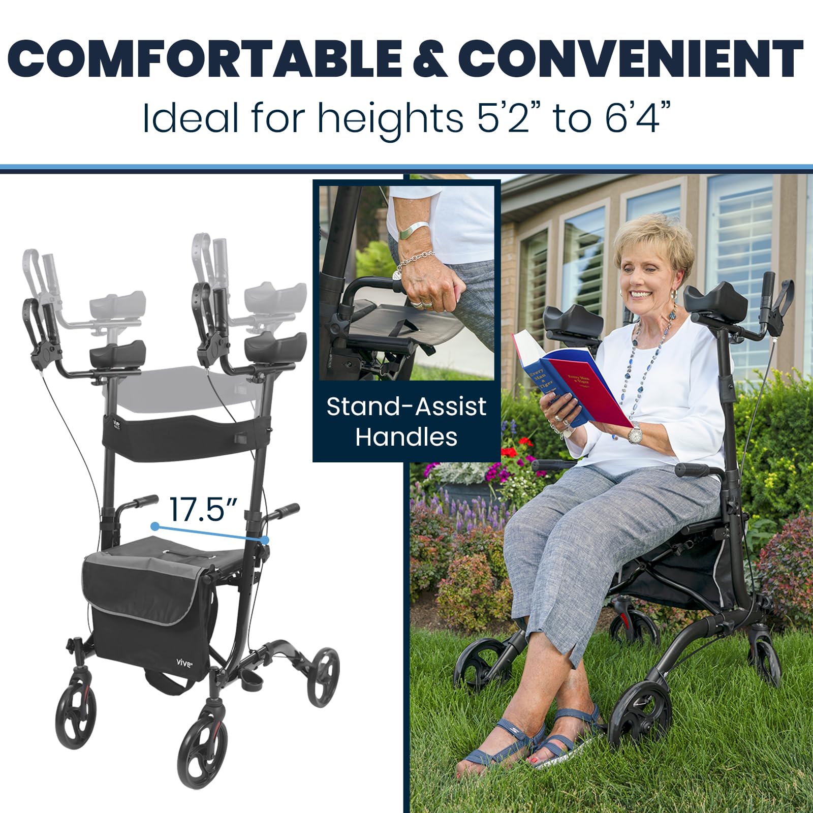 SUPPORTS WALKING UPRIGHT ON ANY SURFACE: The Vive Upright Walker is a superior alternative to ordinary walkers. It can help improve your posture and confidence. It can also help reduce pain in your neck, hips, knees, hands, and wrists. The upright rollator walker features 8”, flat-free wheels for greater stability on many surfaces, and its forearm pads adjust forward and backward, better accommodating different arm lengths.