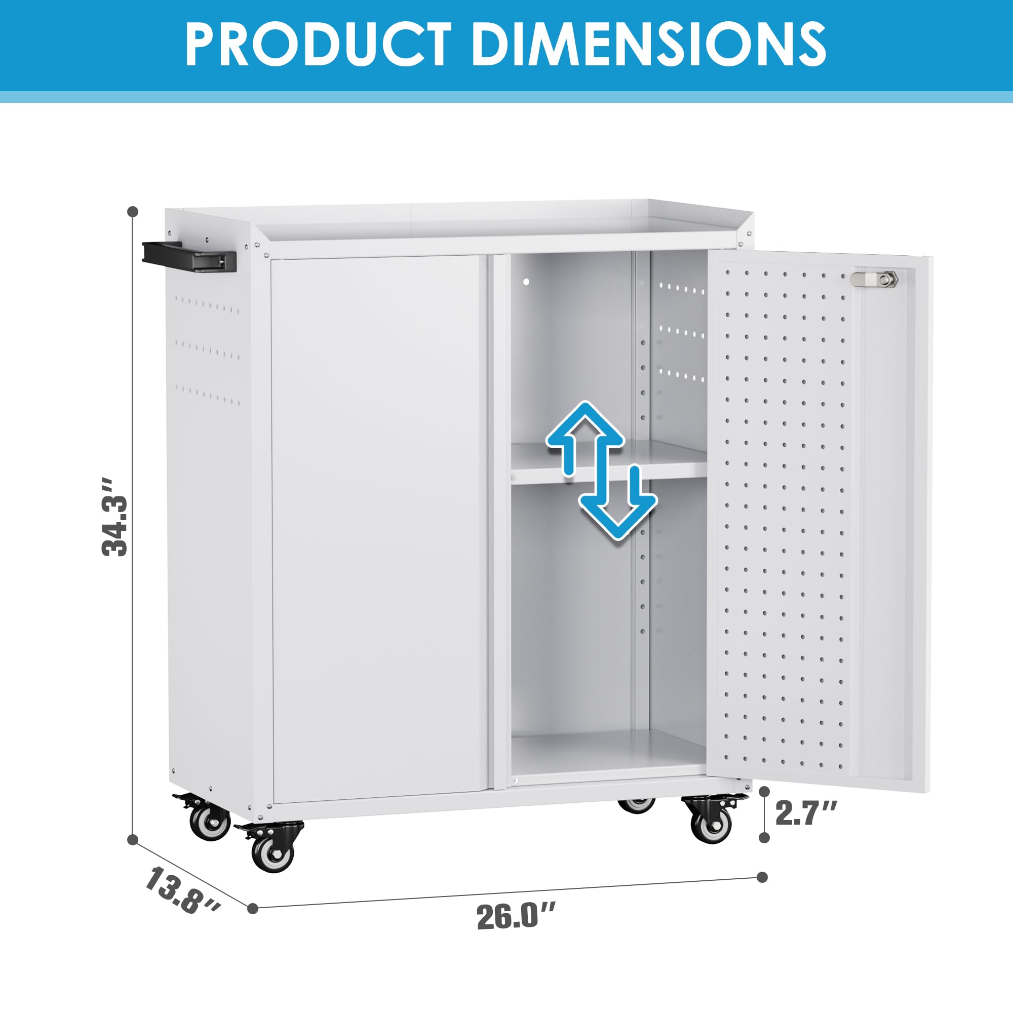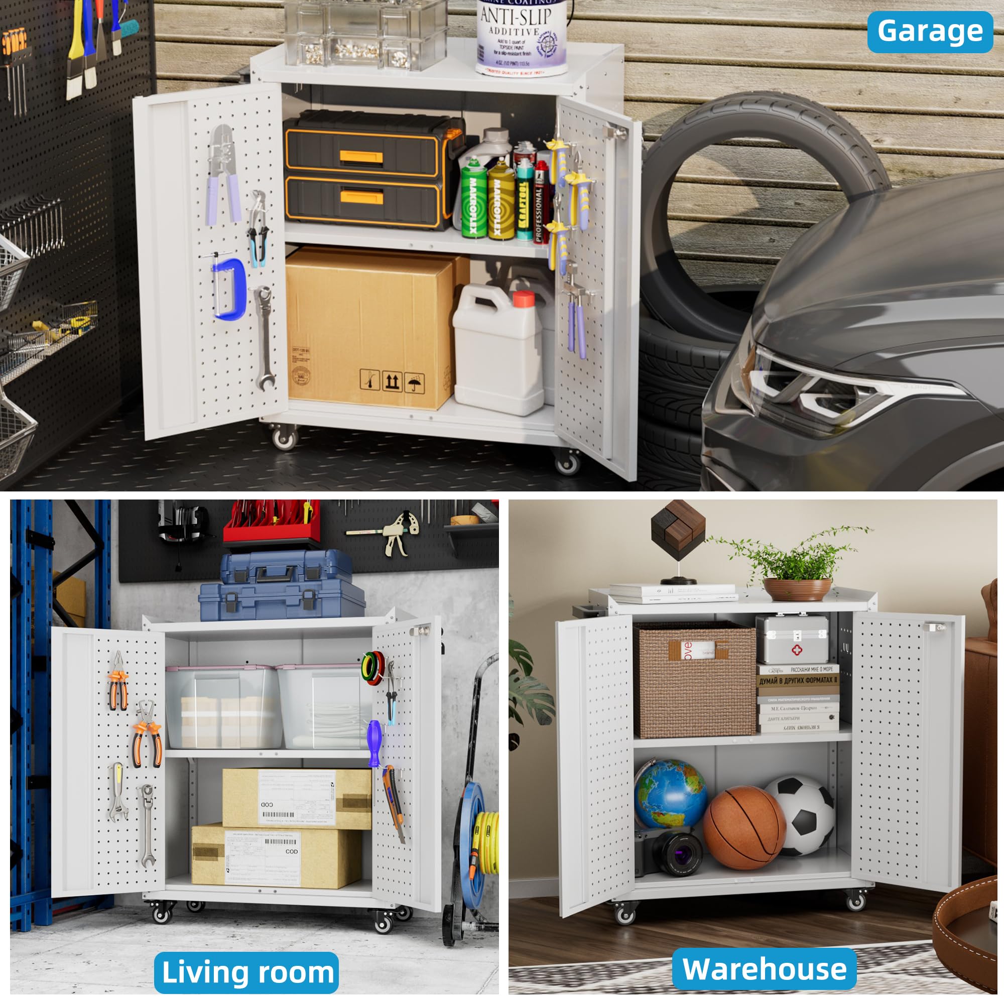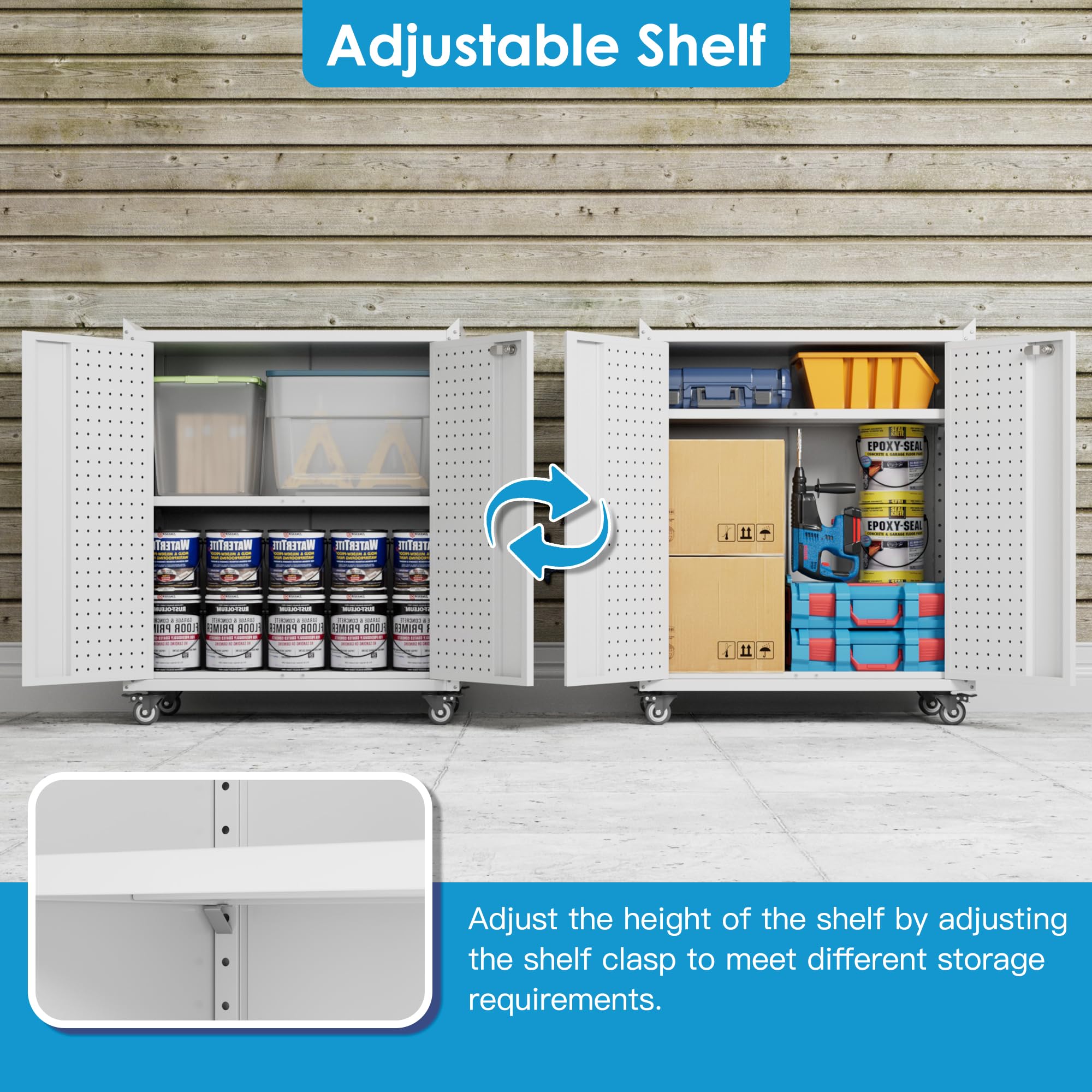 Customizable Pegboard Sides:Maximize vertical space: 1 adjustable shelf (supports bulky items like paint cans). Dual steel pegboards (side panels) organize pliers, hooks, or extension cords within arm’s reach—no more digging through boxes!
